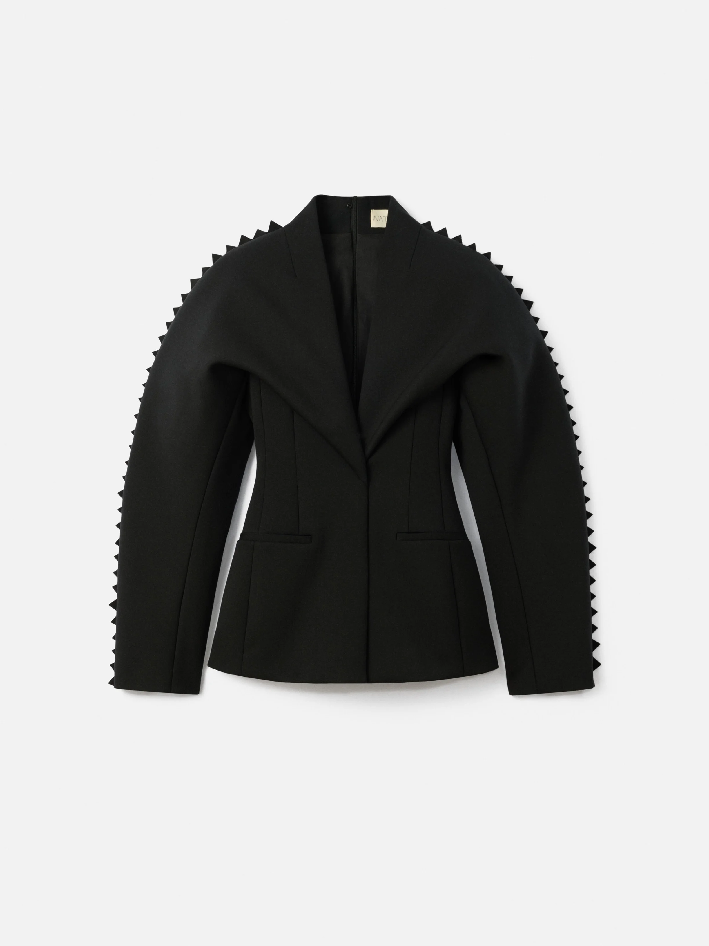 Shawl blazer - Fitted shape - Stretch poly-wool - Collarless - Folded shawl shape on the front - Triangle trim down the length of each sleeve - Hidden button placket - Straight sleeves - Welt pockets The model is 178cm and wears a size 34 53% Polyester - 42% Wool - 5% Elastane / Lining: 48% Cotton - 47% Acetate - Elastane Made in Romania Ref. JAW00133BW007339FK