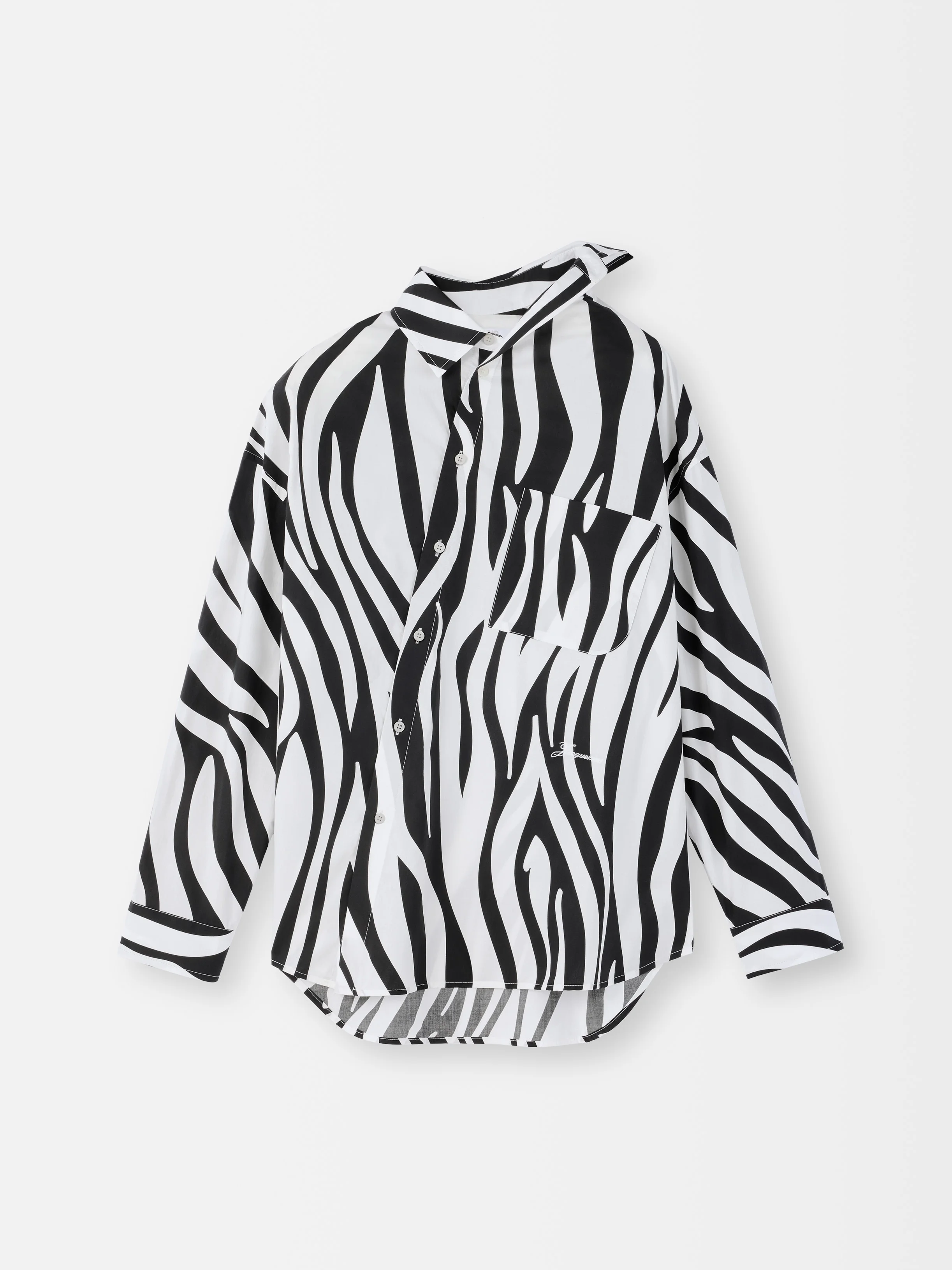 Zebra Arty print asymmetric shirt - Oversized asymmetrical cut - Cotton poplin with Zebra Arty print - Pointed collar - Asymmetrical front button placket - 1950s logo embroidered on front, left - Long sleeves and square cuffs - Asymmetrical "J" chest pocket - Back yoke - "J" back loop - Mother-of-pearl buttons The model is 180cm and wears a size 36 100% Cotton Made in Bulgaria Ref. 251SH086-1705-9CC