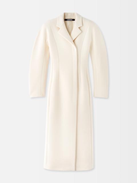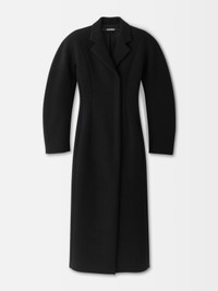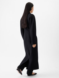 Round-shoulder coat - Long straight fit - Heavy bonded wool - Small notched lapel - Hidden snap-button closure - Rounded sleeves - Fitted waist - Side-seam pockets - Back slit The model is 177cm and wears a size 34 100% Virgin Wool / Lining: 52% Viscose - 48% Cotton Made in France Ref. COW00107AW00429990