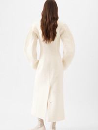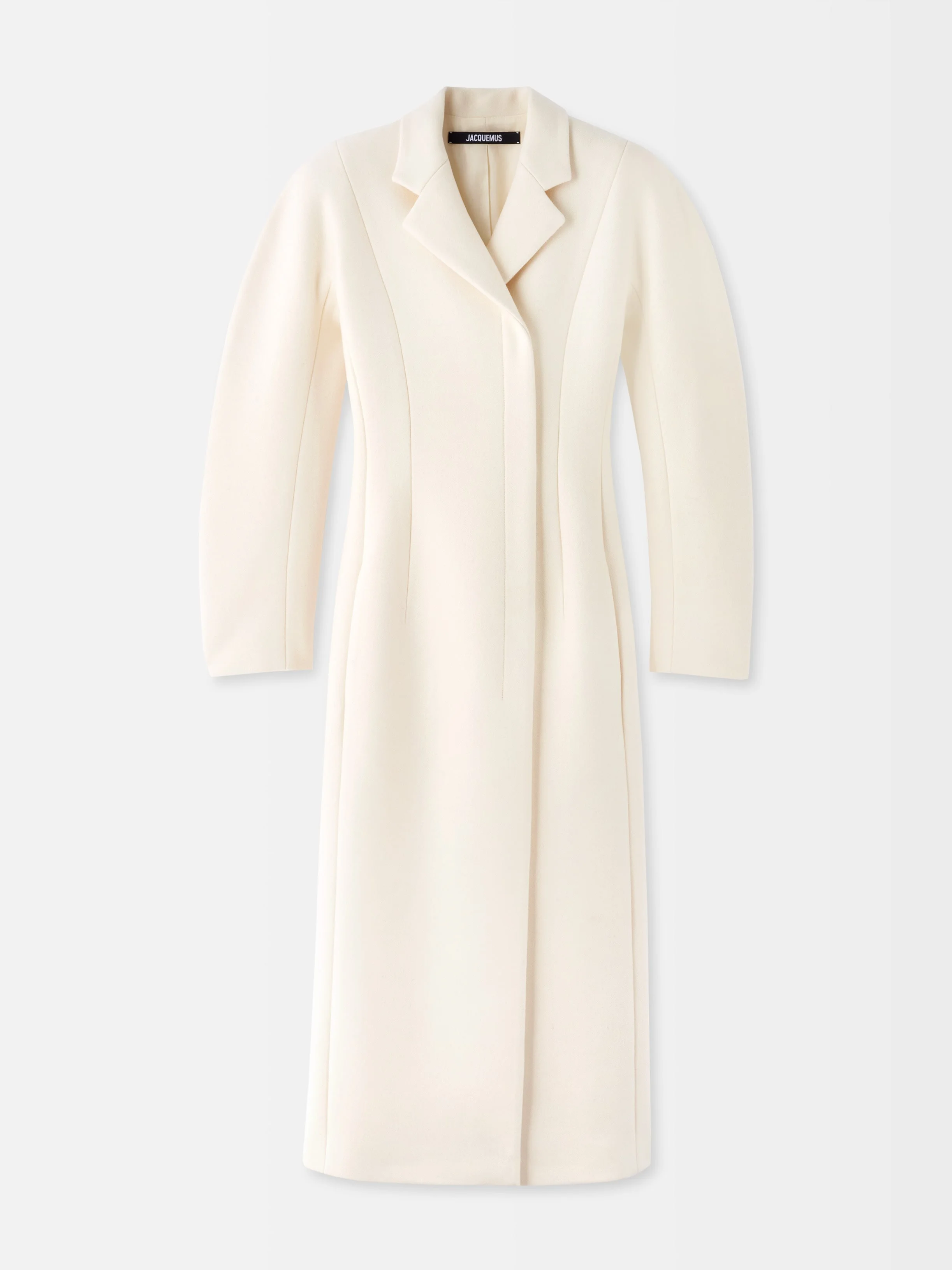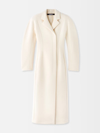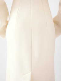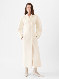 Round-shoulder coat - Long straight fit - Heavy bonded wool - Small notched lapel - Hidden snap-button closure - Rounded sleeves - Fitted waist - Side-seam pockets - Back slit The model is 178cm and wears a size 34 100% Virgin Wool / Lining: 52% Viscose - 48% Cotton Made in France Ref. COW00107AW00429110