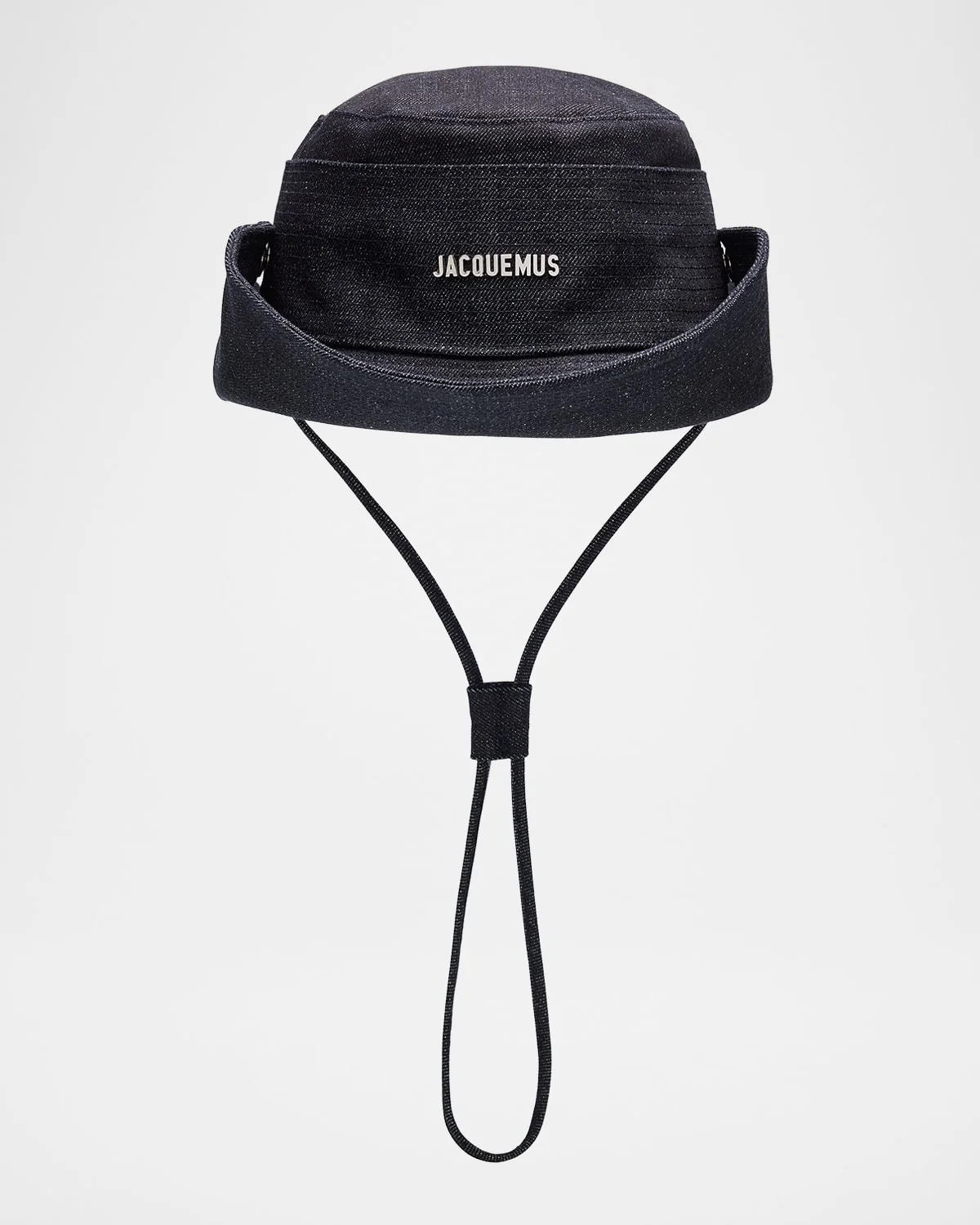 Jacquemus denim bucket hat punctuated with logo print Round crown Topstitched brim Ventilation grommets Side snaps Long, adjustable strap Cotton Made in Bulgaria