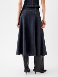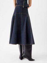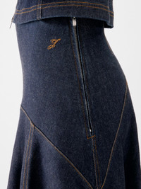 Flared denim skirt - High-rise - Stretch indigo denim-cashmere blend - Contrast stitching - Embroidered “J” on the hip - Rounded hip seams - Side zipper - Godets - Mid-calf length flared hem The model is 179cm and wears a size 34 93% Cotton - 6% Cashmere - 1% Elastane / Lining: 100% Cotton Made in Romania Ref. SKW00639AD00041390