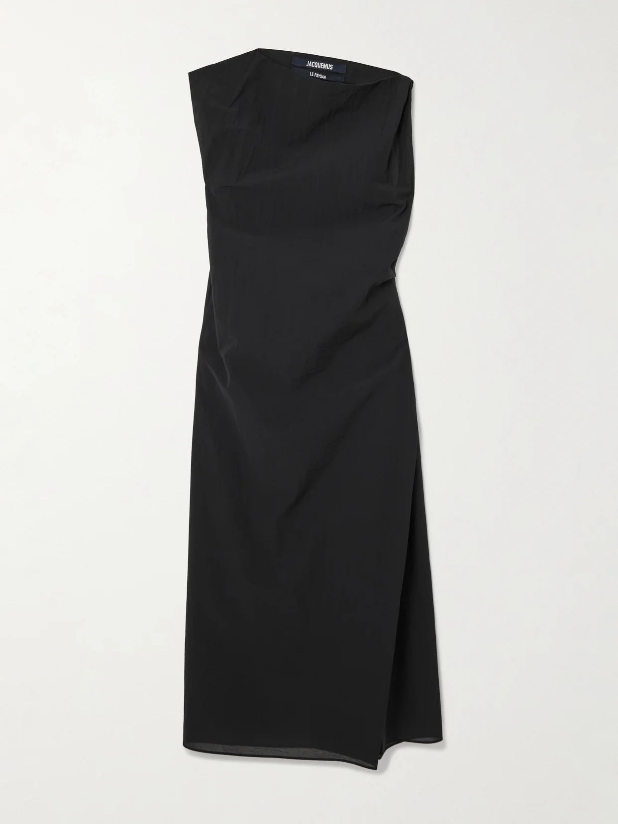 Jacquemus' little black dress is incredibly chic. Cut from cotton-blend gauze, it has a draped asymmetric boat neckline and gathering to the side. Style yours with sky-high heels and a tonal clutch.