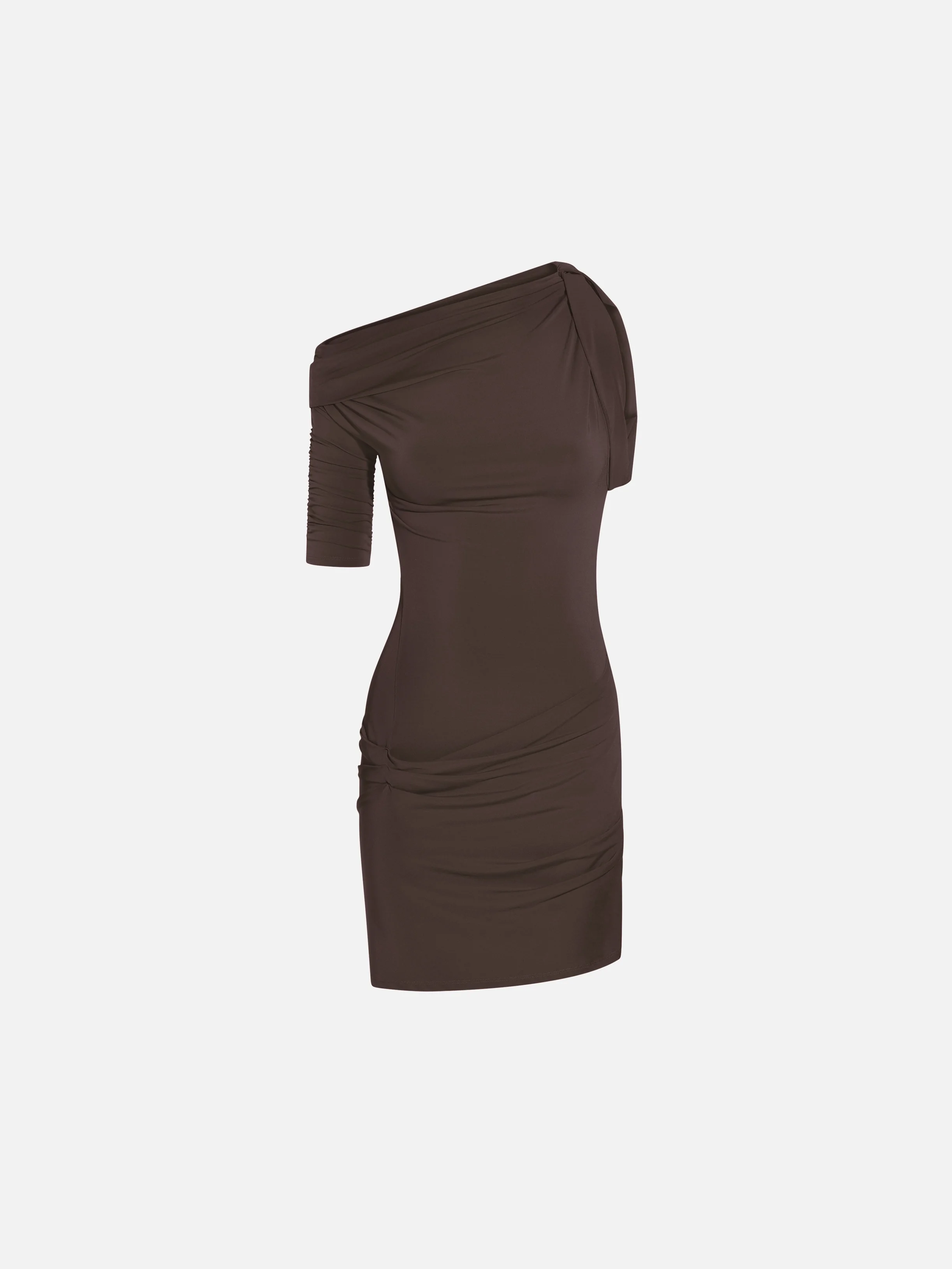 Draped mini dress - Fitted shape - Viscose jersey - Draped asymmetric boat neckline - Knotted neckline detail - Gathered elbow-length sleeve on one side - Pleated hip detail - Mini length The model is 180cm and wears a size XS 71% Viscose - 21% Polyester - 8% Elastane Made in Portugal Ref. DRW00143AJ00136880