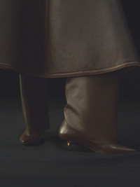 Wide knee-high boots - Structured tubular boots in smooth leather - Trompe-l'oeil smooth leather pump shape - Pointed toe - Cut below the knee - Lambskin leather insole and lining - 4.5cm asymmetric twisted heels with lacquered finish - Contrast outsole To protect the leather soles of all shoes, a transparent protective film has been applied to each sole. To remove it, please follow the direction of the arrow in order not to damage the leather sole. 100% Calf Leather / Outsole: 100% Cow Leather Made in France Ref. FOW00176AC17A02880