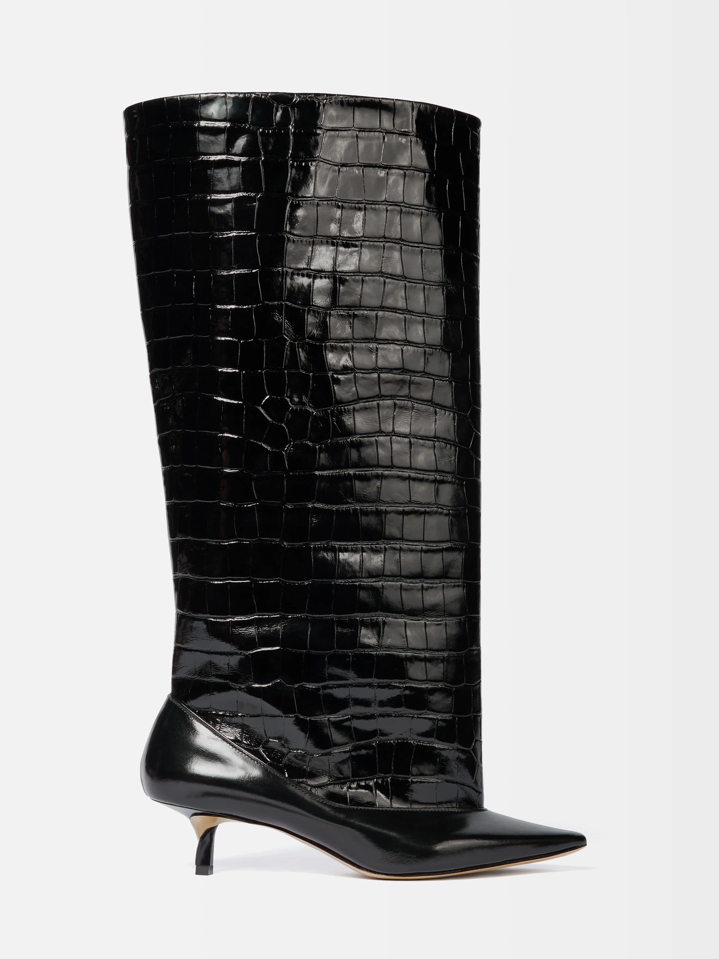 Wide knee-high boots - Structured tubular boots in crocodile-embossed leather - Trompe-l'oeil smooth leather pump shape - Pointed toe - Cut below the knee - Lambskin leather insole and lining - 4.5cm asymmetric twisted heels with lacquered finish - Contrast outsole To protect the leather soles of all shoes, a transparent protective film has been applied to each sole. To remove it, please follow the direction of the arrow in order not to damage the leather sole. 100% Cow Leather / Outsole: 100% Cow Leather Made in France Ref. FOW00176AC24M04990