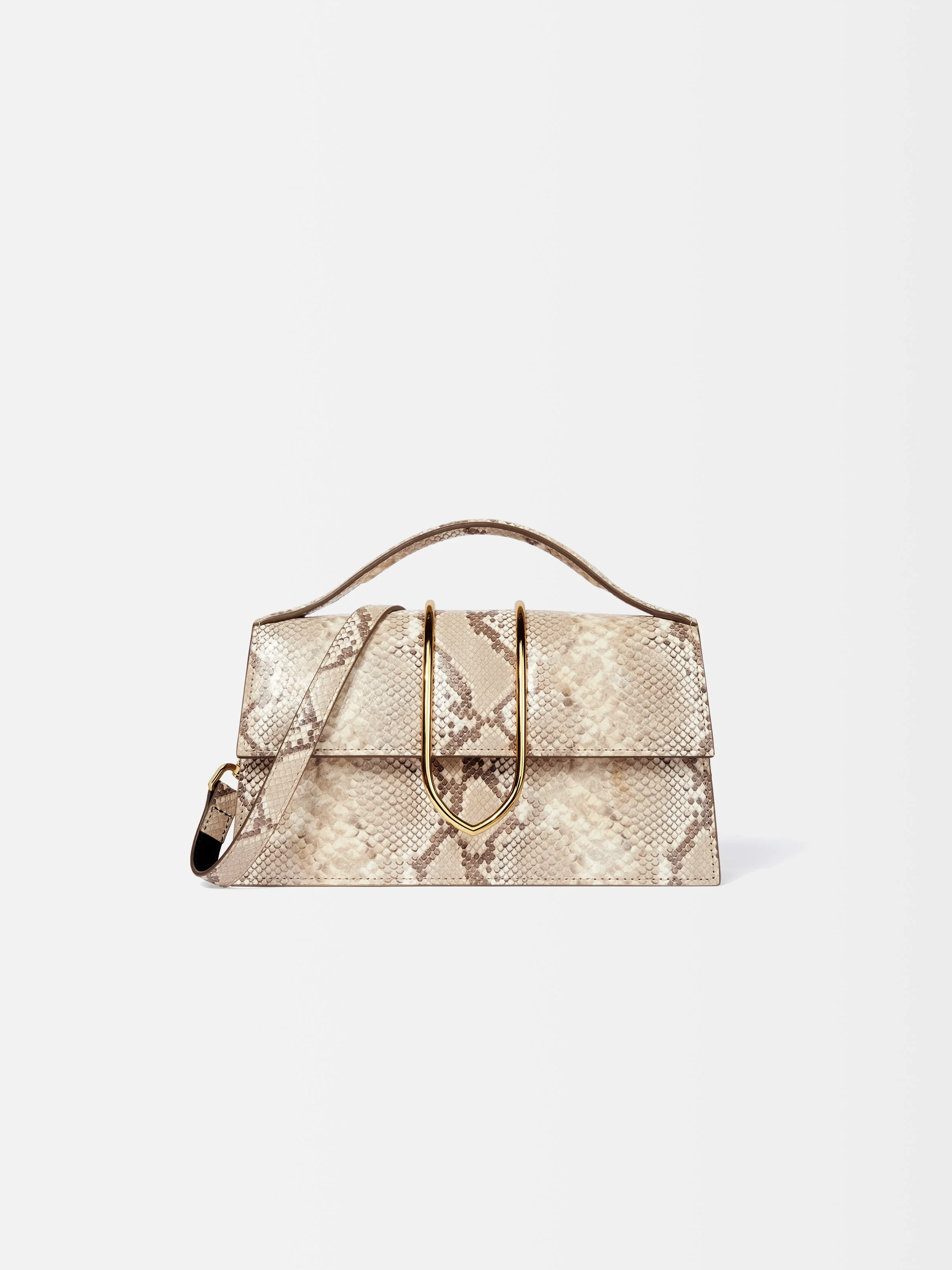 Cross-body metal flap bag - Structured shoulder bag in python-embossed goatskin leather - Gold metal tab-outline closure - Magnetic flap - Small reinforced handle - Removable shoulder strap - Back patch pocket with embossed logo - Interior card pocket - Gold metal hardware - Fully lined in cotton - Height: 13cm - Length: 23.5cm - Width: 7cm Each leather is unique and has been carefully selected by our team. To maintain the original condition of this item, we recommend to avoid direct and over-exposure to light and contact with cosmetics, water or heat. We advise to store this item into the dust bag in a dry place. Made in Italy Ref. BAW00406BC05G01150