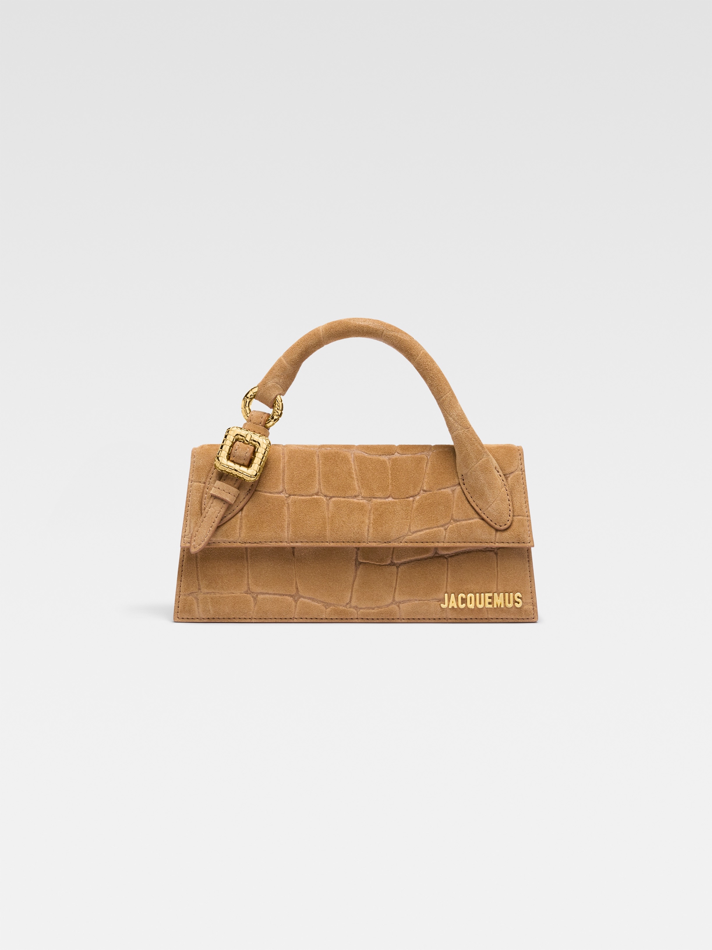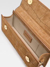 Long signature buckled handbag - Crocodile-embossed, suede leather structured bag - Reinforced handle with gold-plated buckle and ring - Magnetic flap closure - Long removable shoulder strap - Engraved lobster clip - Interior pocket - Gold metal logo and hardware - Fully lined in cotton - Dyed edges - Length: 21.5cm - Height: 18.5cm - Width: 5cm Each leather is unique and has been carefully selected by our team. Its irregularities and color variations are natural. To preserve the original condition of this piece, we recommend keeping it out of the sun and away from cosmetics, water and heat sources. It can be stored in its pouch in a dry place. 100% Calfskin / Lining: 100% Cotton Made in Italy Ref. 233BA326-3243-830