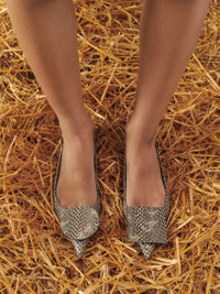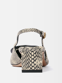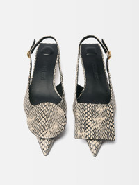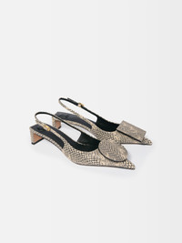 Circle and square kitten heels - Low sling-back heels in cobra-embossed leather - Pointed toe - Circle and square decorative pieces - Gold metal buckle - Embossed logo on insole - Cushioned insoles for added comfort - Lambskin insole and lining with circle and square cushions - Leather heels - Heel height: 4cm To protect the leather soles of all shoes, a transparent protective film has been applied to each sole. To remove it, please follow the direction of the arrow in order not to damage the leather sole. Made in Italy Ref. FOW00076AC05G04150
