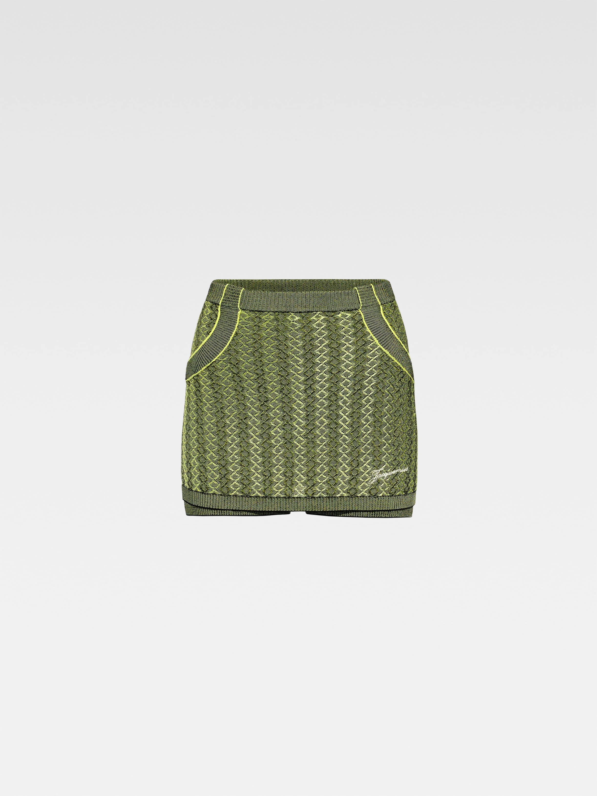 LA CROISIERE Culotte mini skirt - High-waisted - Braided motif stretch viscose - Contrast ribbed waist, details and hem - Apron front panel - Trompe l’oeil pocket - Embroidered logo - Visible shorts in the back The model is 171cm and wears a size 34 93% Viscose - 4% Polyester - 3% Elastane Made in Bulgaria Ref. 251KN606-2433-090