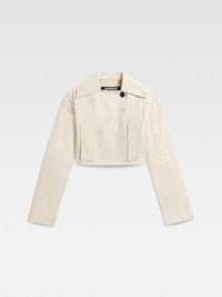Cropped denim jacket - Straight fit - Crocodile embossed denim - Wide pointed collar - Long sleeves - Large welt pockets - Hidden button closure with one visible button - Contrast bartacks - Embroidered patch on the back - Back yoke - Corozo buttons The model is 178cm and wears a size 34 100% Cotton Made in Italy Ref. 251DE074-1731-1JK