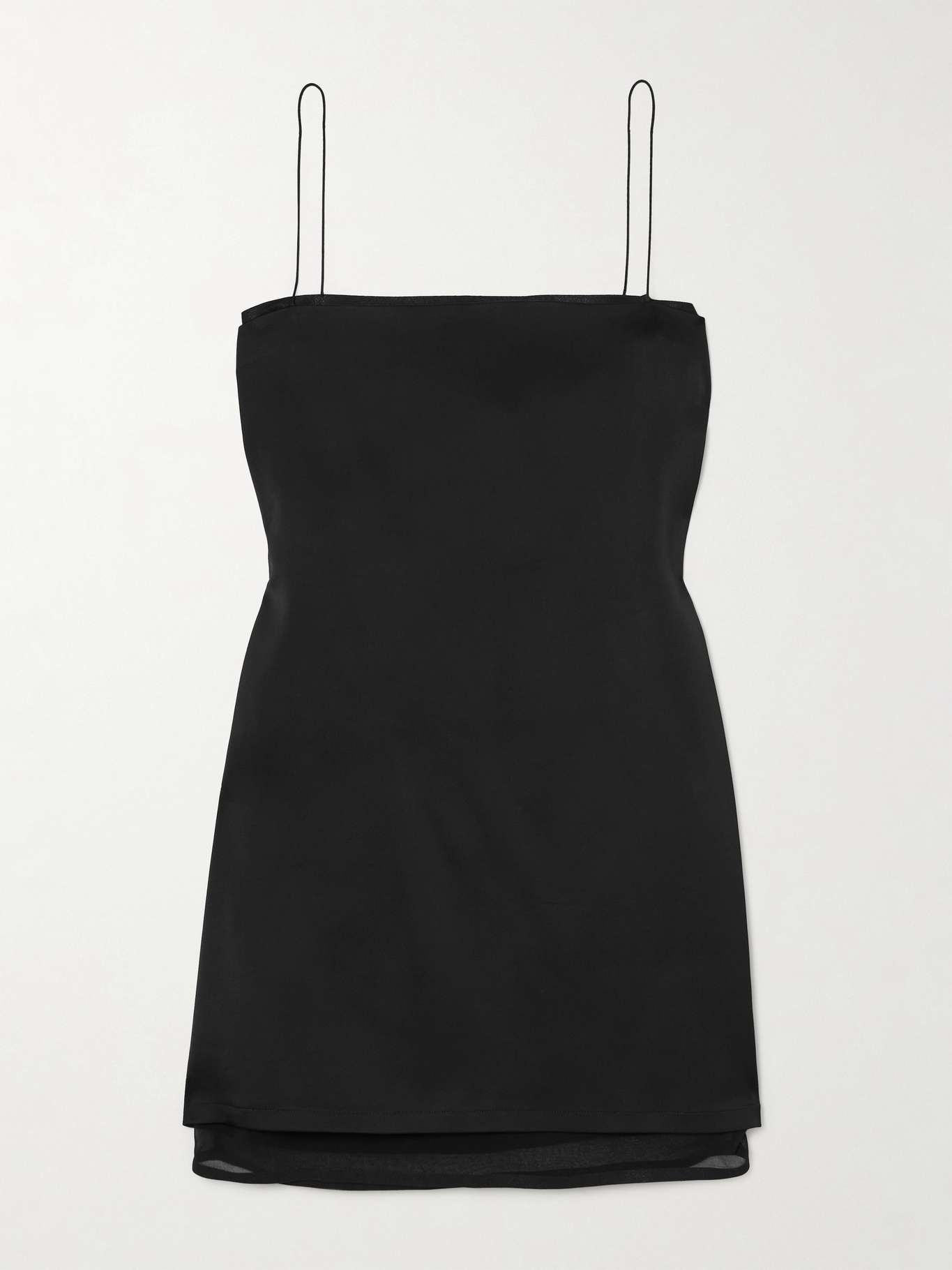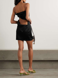 EDITORS'NOTES Jacquemus channels '90s minimalism to create this chic 'The Mia' mini dress. It's made from lustrous satin that's layered with crepe de chine at the hem and has slender, barely-there straps. SIZE & FIT Model measurements: - Fits true to size, however those who are between sizes should take the smaller size - Designed for a slim fit - Mid-weight, non-stretchy fabric - Model is 175cm/ 5'9" and is wearing a FR 34 - Bust: 81cm/ 32" - Waist: 64cm/ 25" - Hip: 89cm/ 35" DETAILS & CARE - Black satin and crepe de chine - Button fastenings at side - 96% viscose, 4% elastane; trim: 100% polyester - Dry clean