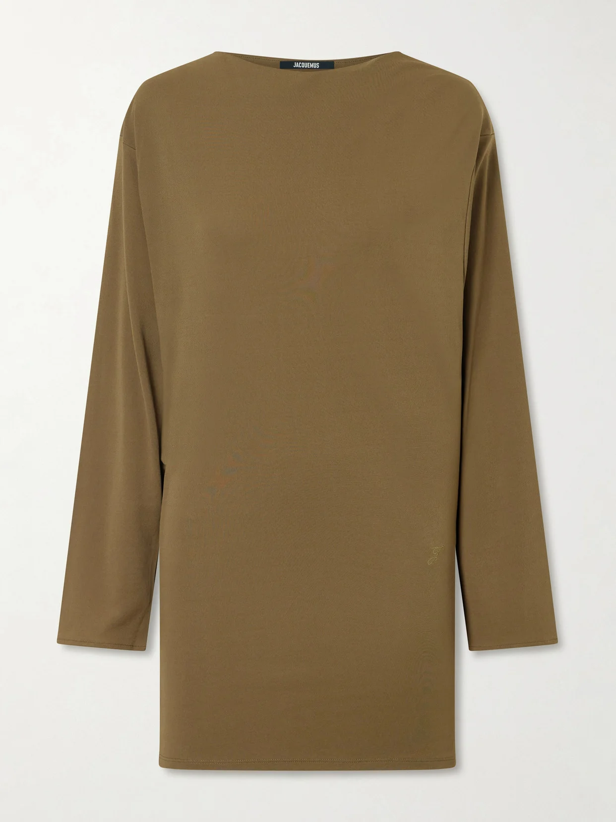 Jacquemus' 'Mistral' mini dress has a draped cutout back, revealing a flash of skin. It's made from jersey for a slightly slouchy fit and has a chic boat neckline. Wear yours with heeled sandals or knee boots.