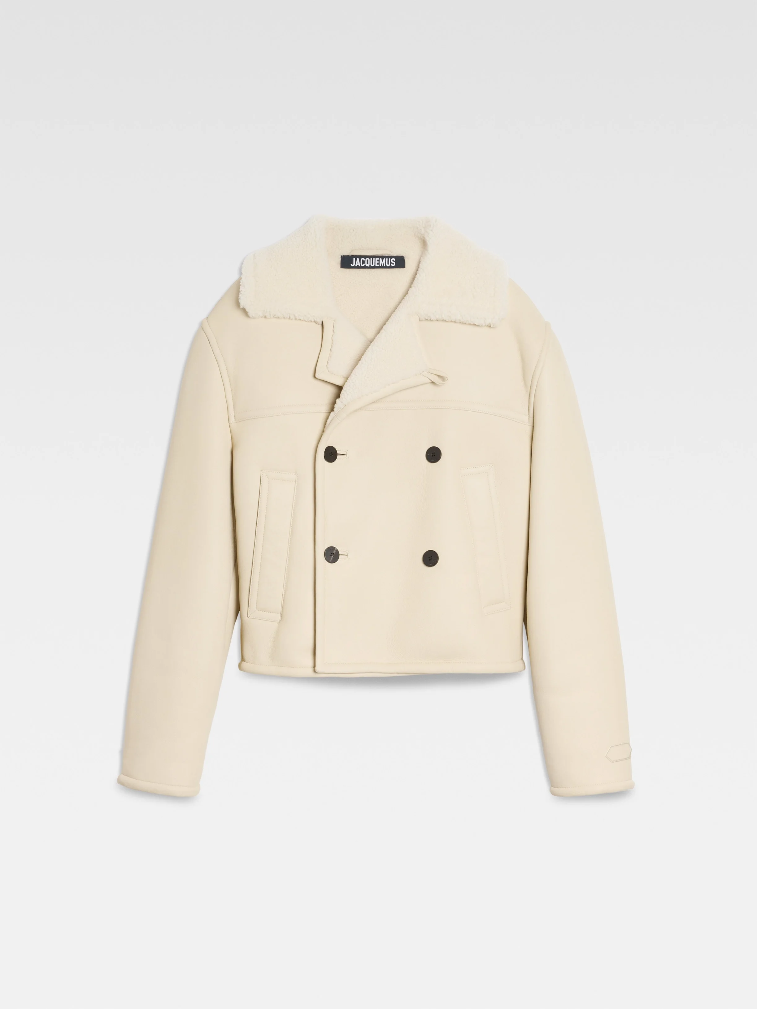 Double-breasted shearling jacket - Straight fit - Leather exterior and soft fleece interior - Shearling collar - Long sleeves - Double-breasted closure - Large welt pockets - Embroidered patch on lower left sleeve - Double stitched seams - Back yoke - Corozo buttons - Calisson logo patch on lower left sleeve The model is 180cm and wears a size 40 100% Sheepskin / Lining: 100% Cotton Made in Turkey Ref. 251CO101-1664-110