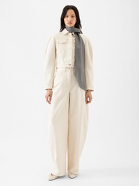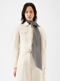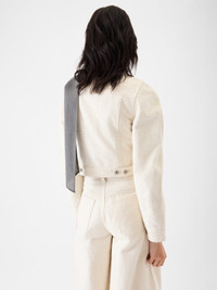 Curved denim jacket - Straight fit - Textured denim jacquard - Pointed collar - Chest patch pockets - Rounded sleeves - Embroidered “J” on the hip - Buttoned cuffs - Back yoke - Adjustable tabs on the hem - Engraved metal buttons The model is 179cm and wears a size 34 100% Cotton Made in France Ref. JAW00112AD00045110