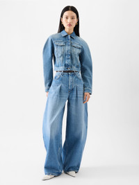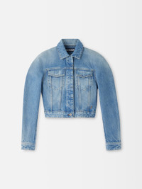 Curved denim jacket - Straight fit - Stonewashed indigo denim - Contrast stitching - Pointed collar - Chest patch pockets - Rounded sleeves - Embroidered “J” on the hip - Buttoned cuffs - Back yoke - Adjustable tabs on the hem - Engraved metal buttons The model is 177cm and wears a size 34 100% Cotton Made in Italy Ref. JAW00112AD0003833C