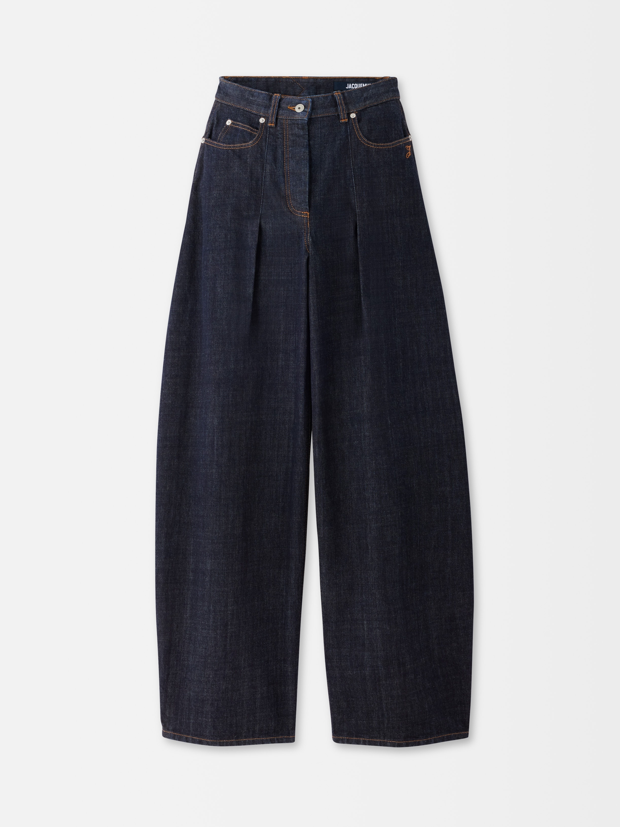 High-waisted curved jeans - High-rise - Rinsed raw indigo denim - Contrast stitching - Belt loops - Zip fly with engraved metal button - Five pockets including ticket pocket - Embroidered “J” on the hip - Darts on the hip - Long curved leg - Embroidered patch on the back - Back yoke - Darts on the back hem The model is 175cm and wears a size 25 100% Cotton / Lining: 65% Polyester - 35% Cotton Made in France Ref. PAW00609AD00036390