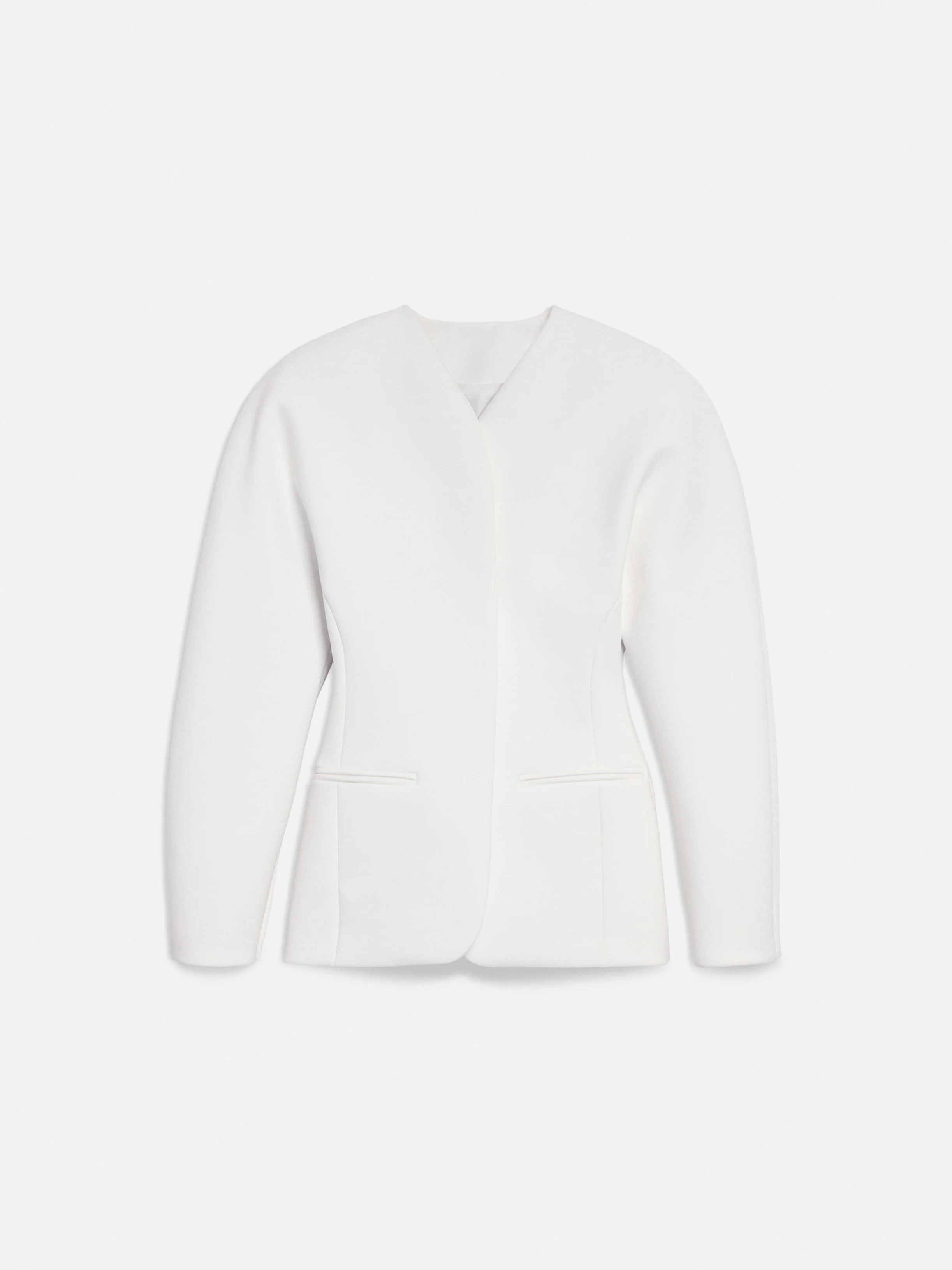 Fitted jacket - Tailored fit - Stretch viscose blend - Collarless - Rounded shoulders - Long sleeves - Hidden button closure - Fitted waist - Jet pockets - Buttoned sleeves - Open back slit The model is 176cm and wears a size 34 62% Polyester - 33% Viscose - 5% Elastane / Lining: 48% Cotton - 47% Acetate - 5% Elastane Made in Bulgaria Ref. JAW00045AW00531100