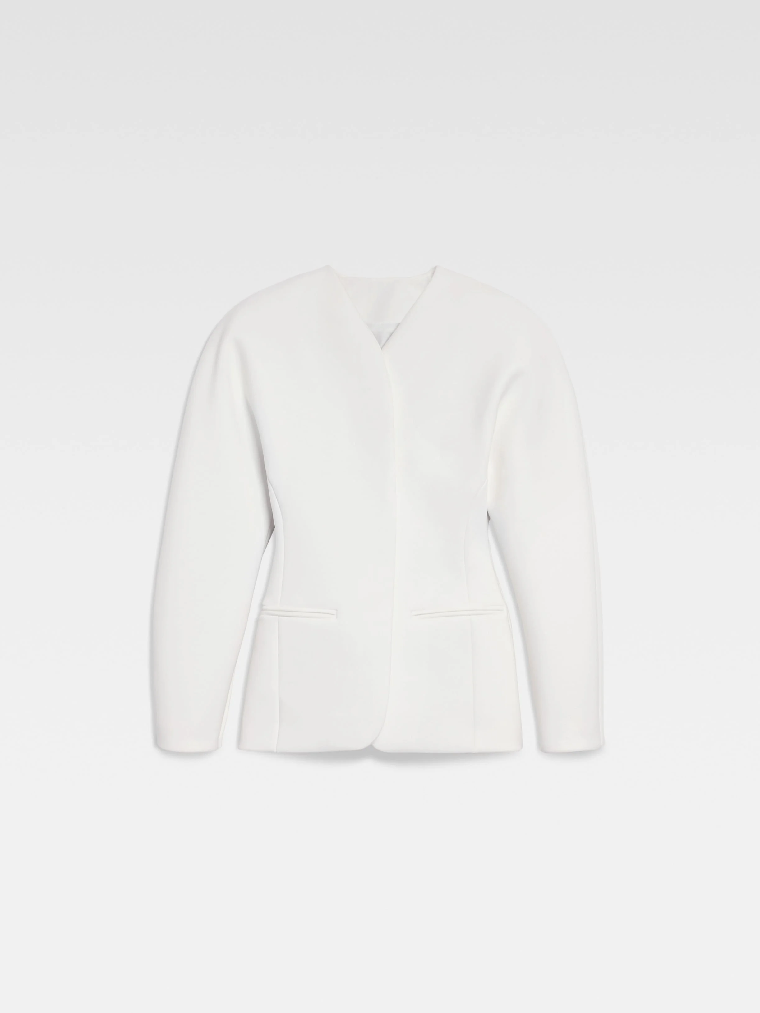 LA CROISIERE Fitted jacket - Tailored fit - Stretch viscose blend - Collarless - Rounded shoulders - Long sleeves - Hidden button closure - Fitted waist - Jet pockets - Buttoned sleeves - Open back slit The model is 175cm and wears a size 34 62% Polyester - 33% Viscose - 5% Elastane / Lining: 48% Cotton - 47% Acetate - 5% Elastane Made in Bulgaria Ref. 241JA045-1718-100