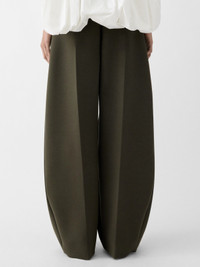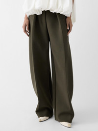 Curved pants - High-waisted ⁃ Stretch polyester and viscose blend - Wide, curved fit - Grown-on waist - Belt loops - Zip fly with hook and button - Stitched pleats - Side-seam pockets - Split waistband in the back - Back welt pocket with "J" button loop - Fully lined The model is 176cm and wears a size 34 62% Polyester - 33% Viscose - 5% Elastane / Lining : 97% Cotton - 3% Elastane Made in Bulgaria Ref. PAW00079AW00531580