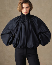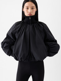 Parachute bomber - Rounded fit - Matt lightweight nylon - Draped outer shell - Ribbed funnel collar, cuffs and hem - Zipped closure with long leather puller - Zipped pockets - Wadded interior - Fully lined The model is 177cm and wears a size 34 96% Polyamide - 4% Polyurethane / Lining: 55% Cotton - 45% Polyester Made in Tunisia Ref. OUW00108AW00645990