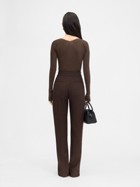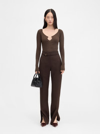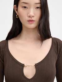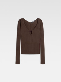 Long-sleeved scalloped top - Fitted shape - Rib knit - Open scalloped neckline - Gold metal charm logo with keyhole neckline The model is 175cm and wears a size 34 76% Viscose - 24% Polyamide Made in Romania Ref. 251KN357-2424-880