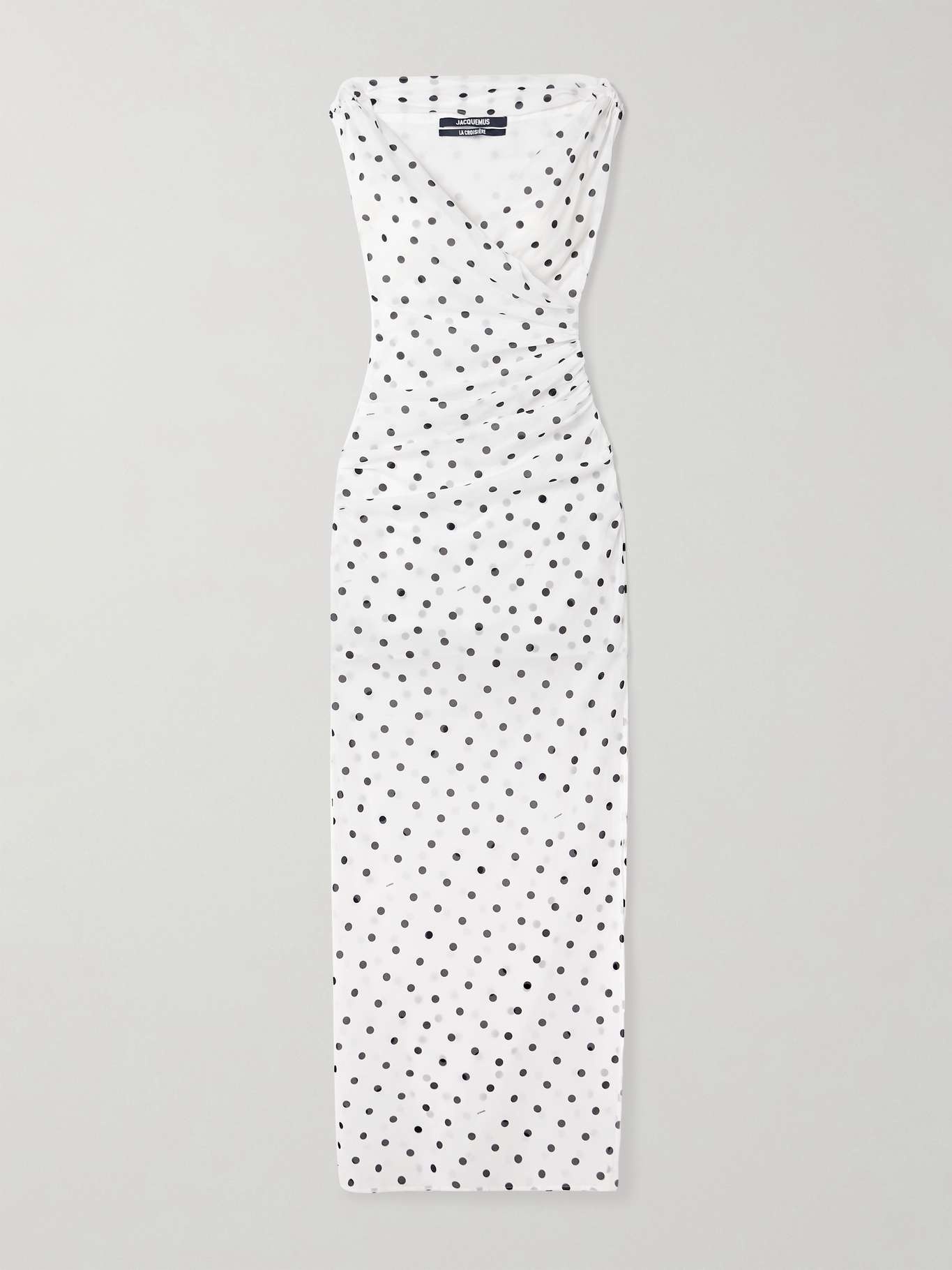 EDITORS'NOTES Jacquemus' 'Rita' dress is part of the brand's '50s-inspired Spring '25 collection. Cut from crepe de chine, it's printed with retro polka-dots and has a gently gathered bodice with padded cups and underwiring. The slightly off-the-shoulder V-neckline will beautifully frame your decolletage. SIZE & FIT - Fits true to size, take your normal size - Cut for a close fit - Lightweight, non-stretchy fabric - Model is 180cm/ 5'11" and is wearing a FR 36 - Bust: 76cm/ 30" - Waist: 62cm/ 24.5” - Hip: 91cm/ 36” DETAILS & CARE - White and black crepe de chine - Concealed hook and zip fastening at side - 56% polyamide, 32% silk, 12% elastane; lining1: 69% polyamide, 31% elastane; lining2: 55% cotton, 45% polyester - Dry clean