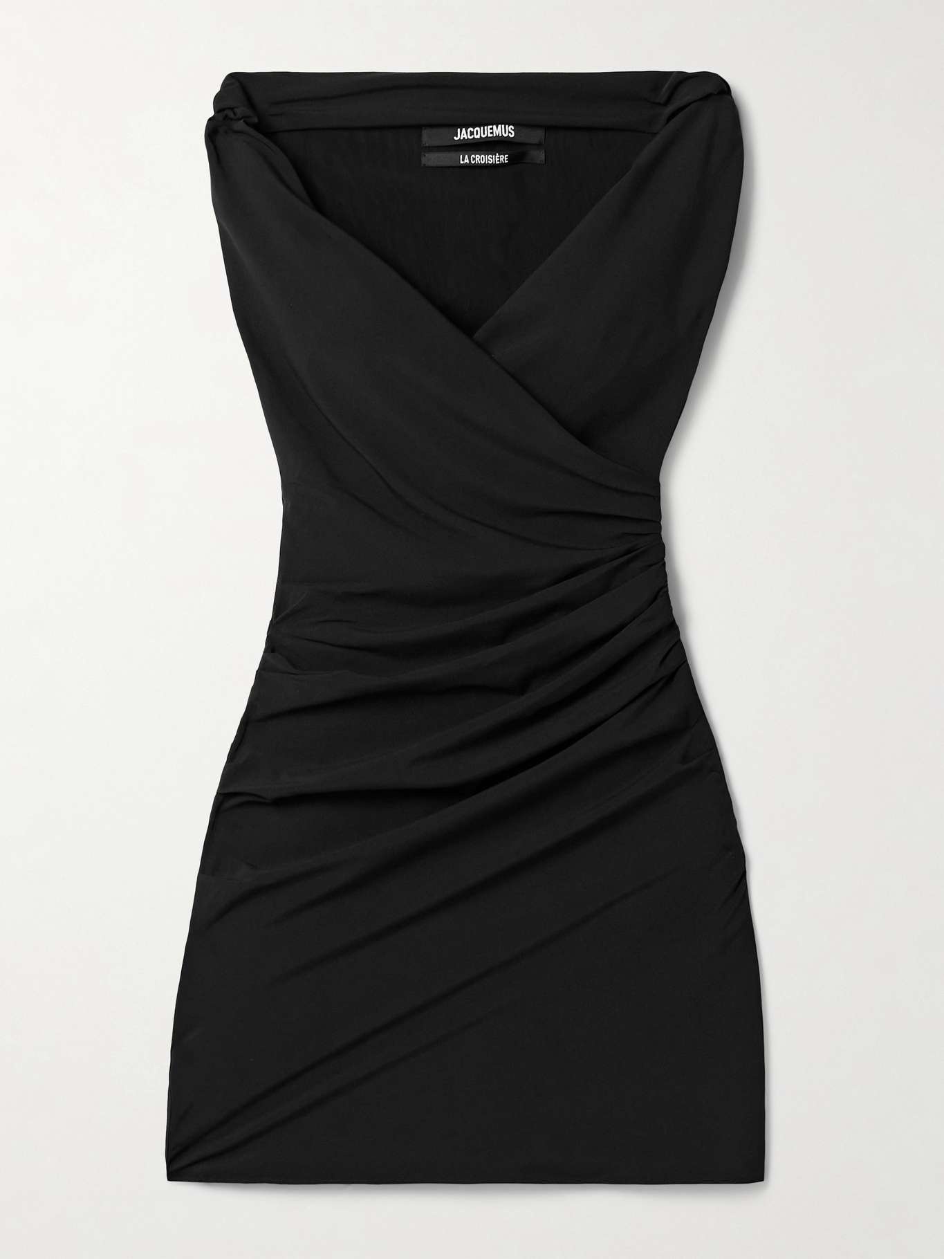 EDITORS'NOTES Jacquemus' 'Rita' mini dress is a refreshingly modern take on the classic LBD. It's artfully draped from crepe de chine with a slightly off-the-shoulder V-neckline. The cups are complete with padding and underwiring so you can forgo a bra. SIZE & FIT - Fits true to size, take your normal size - Designed for a close fit - Lightweight, non-stretchy fabric - Model is 180cm/ 5'11" and is wearing a FR 36 - Bust: 76cm/ 30" - Waist: 62cm/ 24.5” - Hip: 91cm/ 36” DETAILS & CARE - Black crepe de chine - Concealed hook and zip fastening at side - 82% polyester, 18% elastane; trim: 100% cotton; lining: 55% cotton, 45% polyester - Dry clean
