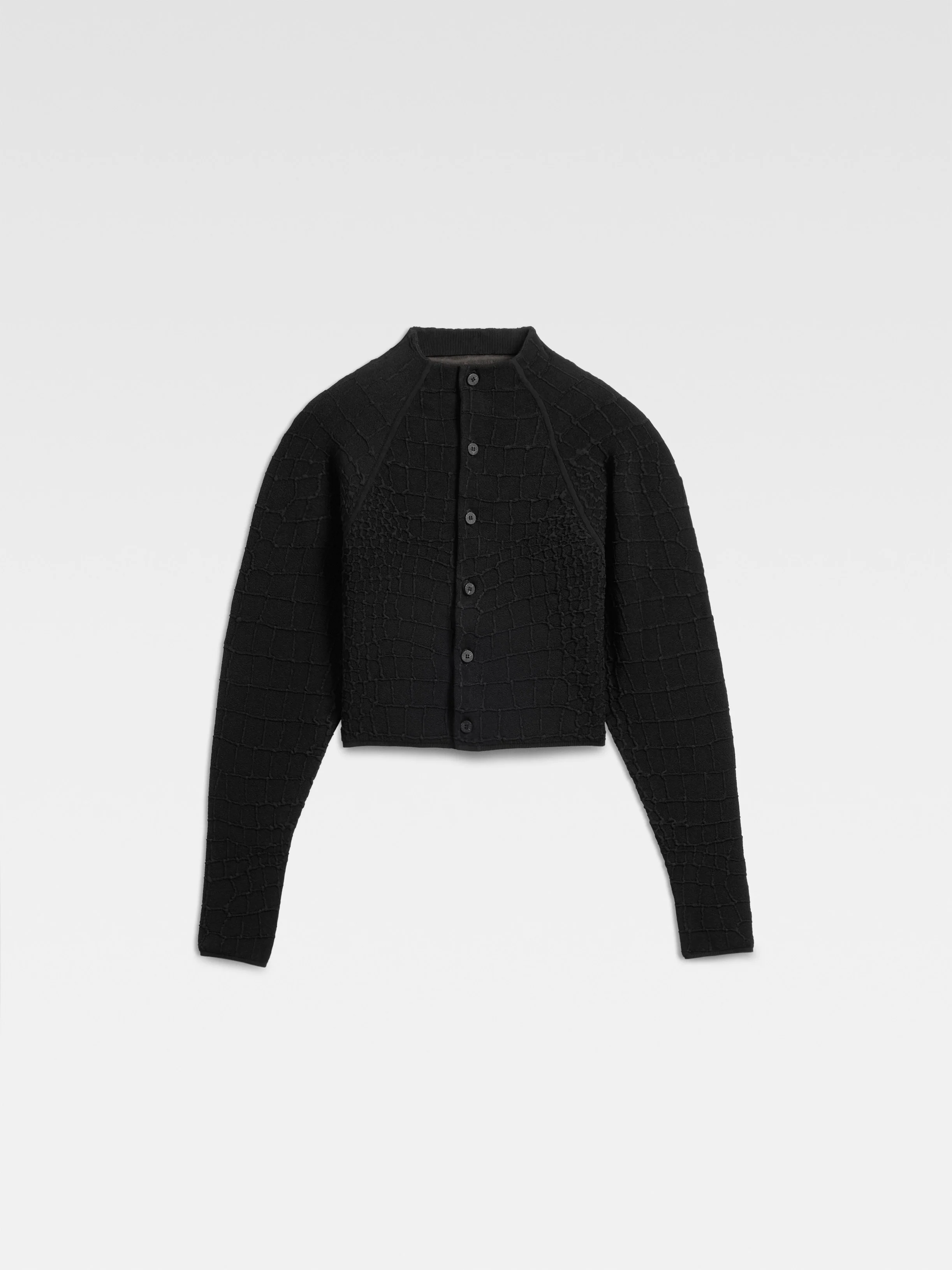 LA CROISIERE High-neck cardigan - Straight fit - Crocodile embossed stretch viscose - Integrated stand collar - Raglan sleeves - Ribbed collar, cuffs and hem - “J” locker loop The model is 180cm and wears a size 34 78% Viscose - 20% Polyamide - 2% Elastane Made in Portugal Ref. 251KN579-2429-990