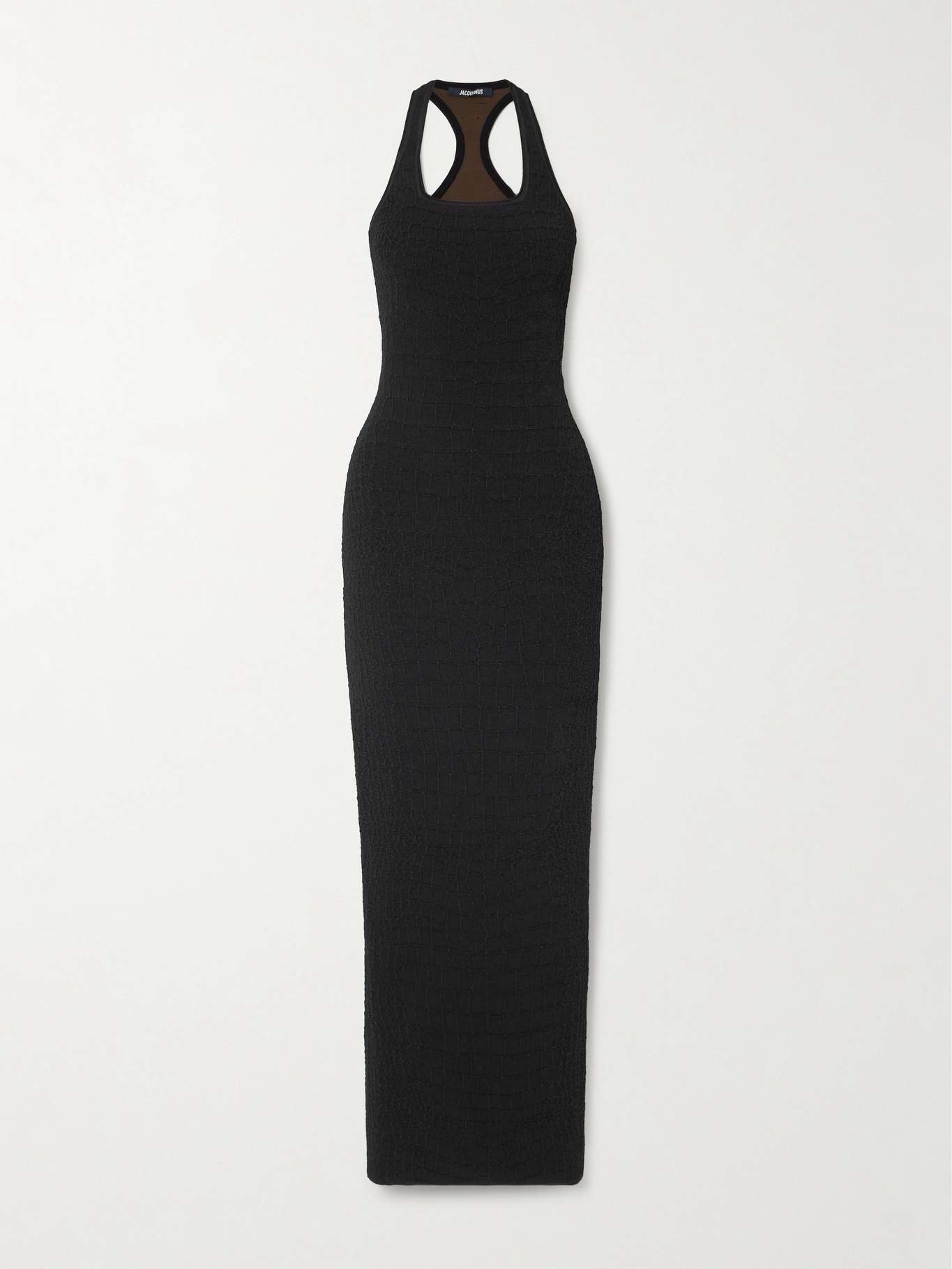 EDITORS'NOTES Jacquemus' 'The Scala' dress is jacquard-knitted with a croc-effect pattern - it lends interesting texture without detracting from the classic, minimal style. Designed to contour your figure, it has sporty racerback straps and a signature 'J' loop at the nape of the neck. SIZE & FIT Model measurements: - Fits true to size, take your normal size - Designed for a close fit - Fine knit - Model is 177cm/ 5'10" and is wearing a FR 36 - Bust: 85cm/ 33” - Waist: 66cm/ 26” - Hip: 92cm/ 36” DETAILS & CARE - Black jacquard-knit - Slips on - 72% viscose, 25% polyamide, 3% elastane - Hand wash
