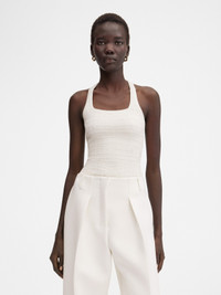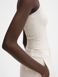 Racerback tank-top - Fitted shape - Crocodile embossed stretch viscose - Square neckline - Raceback - “J” locker loop The model is 179cm and wears a size XS 72% Viscose - 25% Polyamide - 3% Elastane Made in Portugal Ref. 251KN587-2429-110