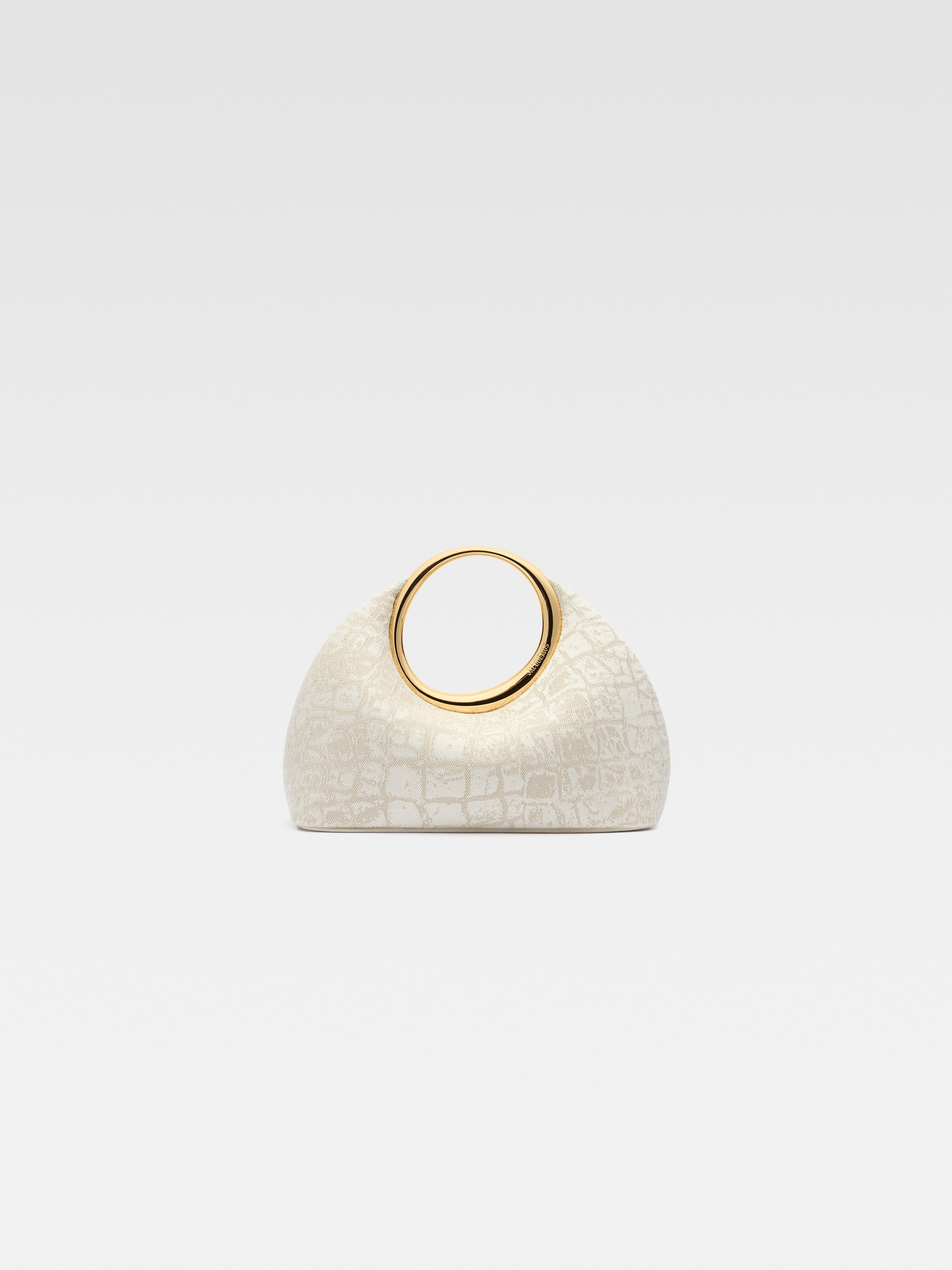 Mini ring handbag - Jacquard denim handbag - Organic shape with integrated engraved ring handle - Magnetic closure - Flat bottom - Fully lined in cotton - Height 16.5 cm - Length 22.5 cm - Width 8.5 cm 100% Cotton / Lining: 100% Cotton Made in Italy Ref. 241BA395-1731-1JK
