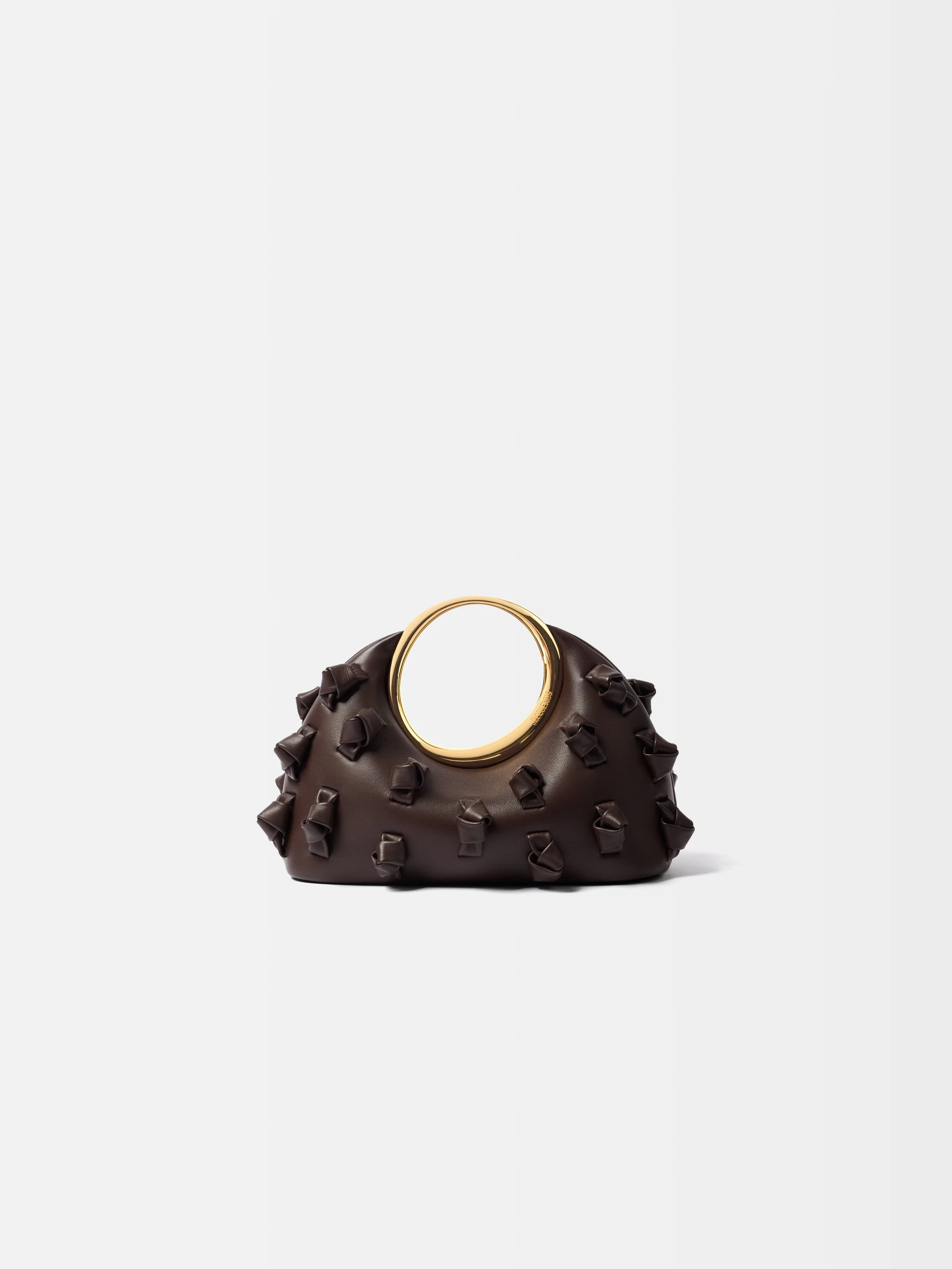 Mini ring handbag - Handbag in supple lambskin leather - Matching leather bow applique - Organic shape with integrated engraved ring handle - Magnetic closure - Flat bottom - Fully lined in cotton - 6,5 in x 8,9 in x 3,3 in Each leather is unique and has been carefully selected by our team. To maintain the original condition of this item, we recommend to avoid direct and over-exposure to light and contact with cosmetics, water or heat. We advise to store this item into the dust bag in a dry place. 100 % Lamb Leather / Lining: 100% Cotton Made in Italy Ref. BAW00443AC27L14890