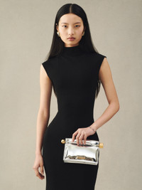 WINTER RETREAT Mini take-away pouch bag - Folded pouch in lame - Rolls open to access interior - Gold metal circle and square closure endings - Long chain strap in golded metal - Magnetic closure - Inside card pocket - Gold metal logo and hardware - Fully lined in cotton - Height: 12.5 cm - Length: 19.4 cm - Width: 6.6 cm 69% Polyurethane - 31% Polyester / Lining : 100% Cotton Made in Italy Ref. BAW00392AW00330980