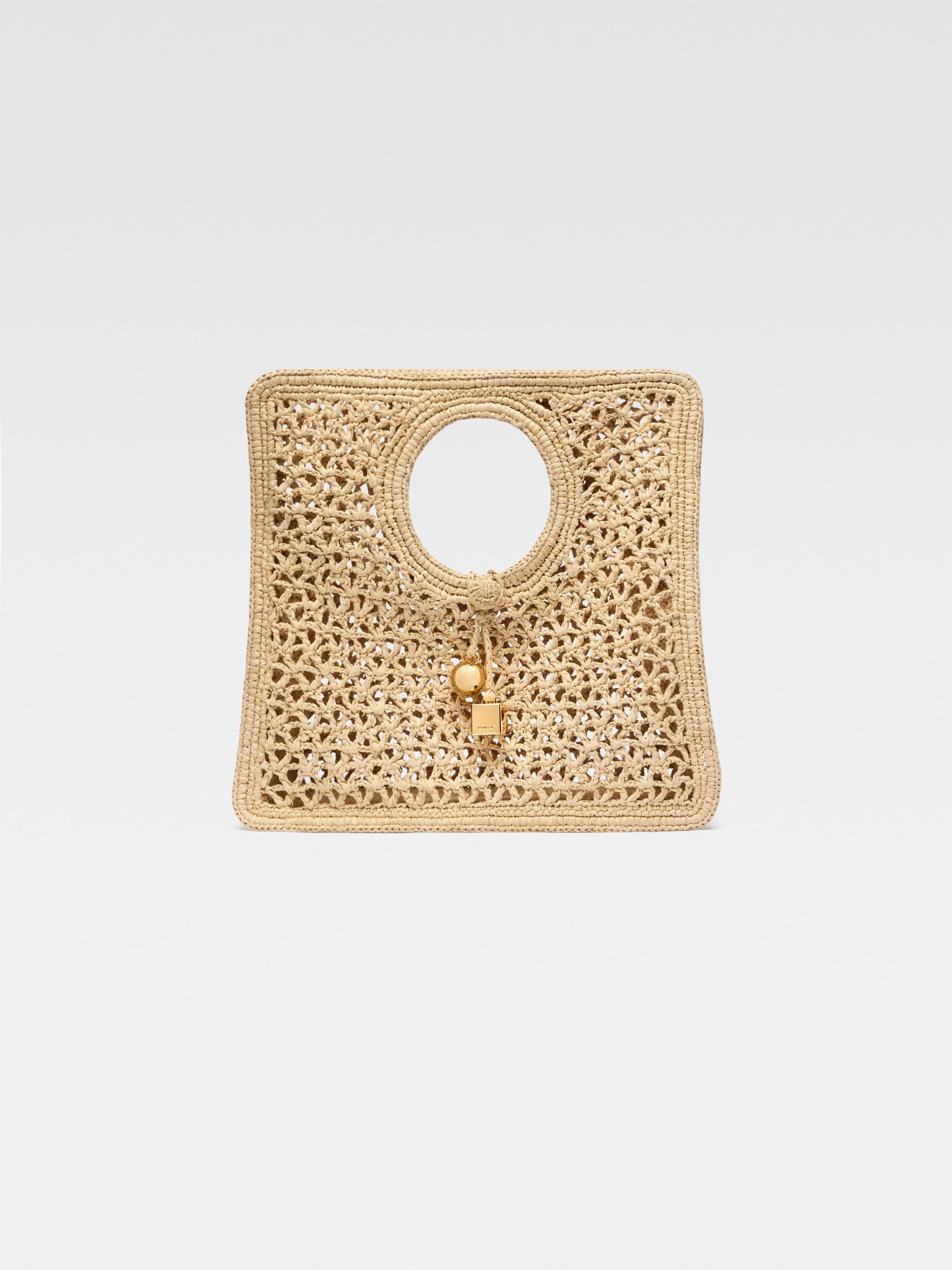 LA CROISIERE Small square raffia bag - Small flat woven-raffia basket bag - Knot closure - Gold metal Rond-Carre charms - Contrast reinforced braided edges - Length: 35cm - Height: 35cm - Width: 11cm - Handle diameter: 11.5cm Each fabric is unique and has been carefully selected by our team. Handwoven, this material can show natural irregularities in the texture and shape of the fibers, contributing to its unique character. To maintain the original condition of this item, we recommend to avoid direct and over-exposure to light and contact with cosmetics, water or heat. We advise to store this item into the dust bag in a dry place. 100% Raffia Made in Madagascar Ref. 251BA421-3219-142