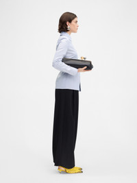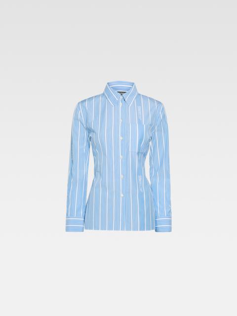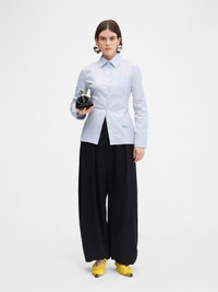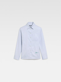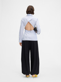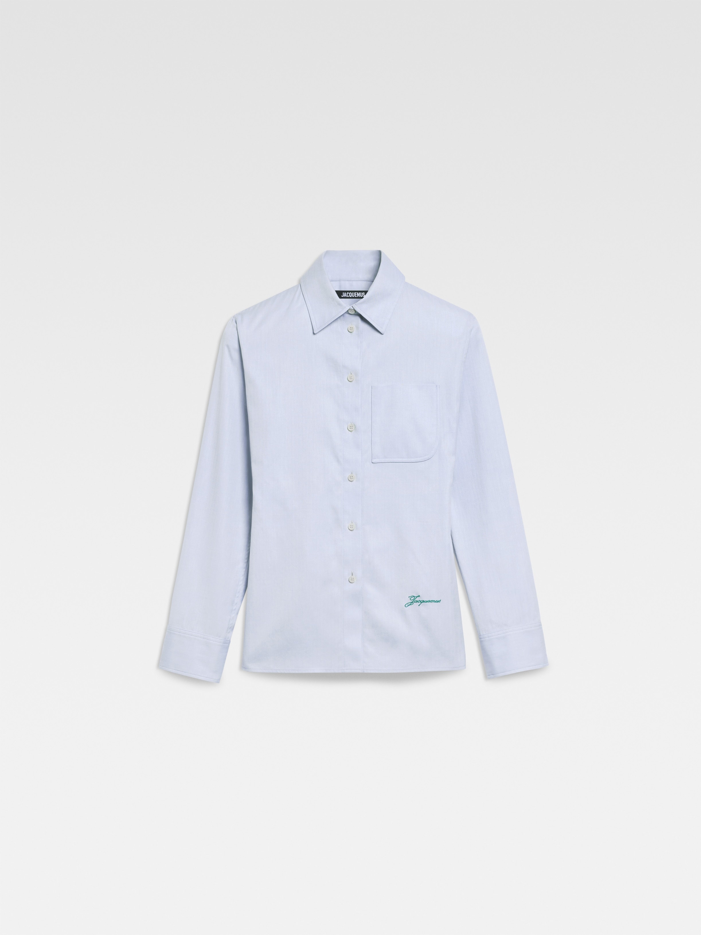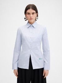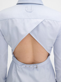 LA CROISIERE Open-back suit shirt - Straight fitted shape - Herringbone poplin - Pointed collar - Asymmetric “J” shaped chest pocket - Green 50’s embroidered logo - Long sleeves - Square cuffs - “J” locker loop - Triangular open back - Integrated belt in the back - Metal buckle and stud buttons - Mother-of-pearl buttons The model is 173cm and wears a size 34 96% Cotton - 4% Elastane Made in Bulgaria Ref. 243SH064-1726-910