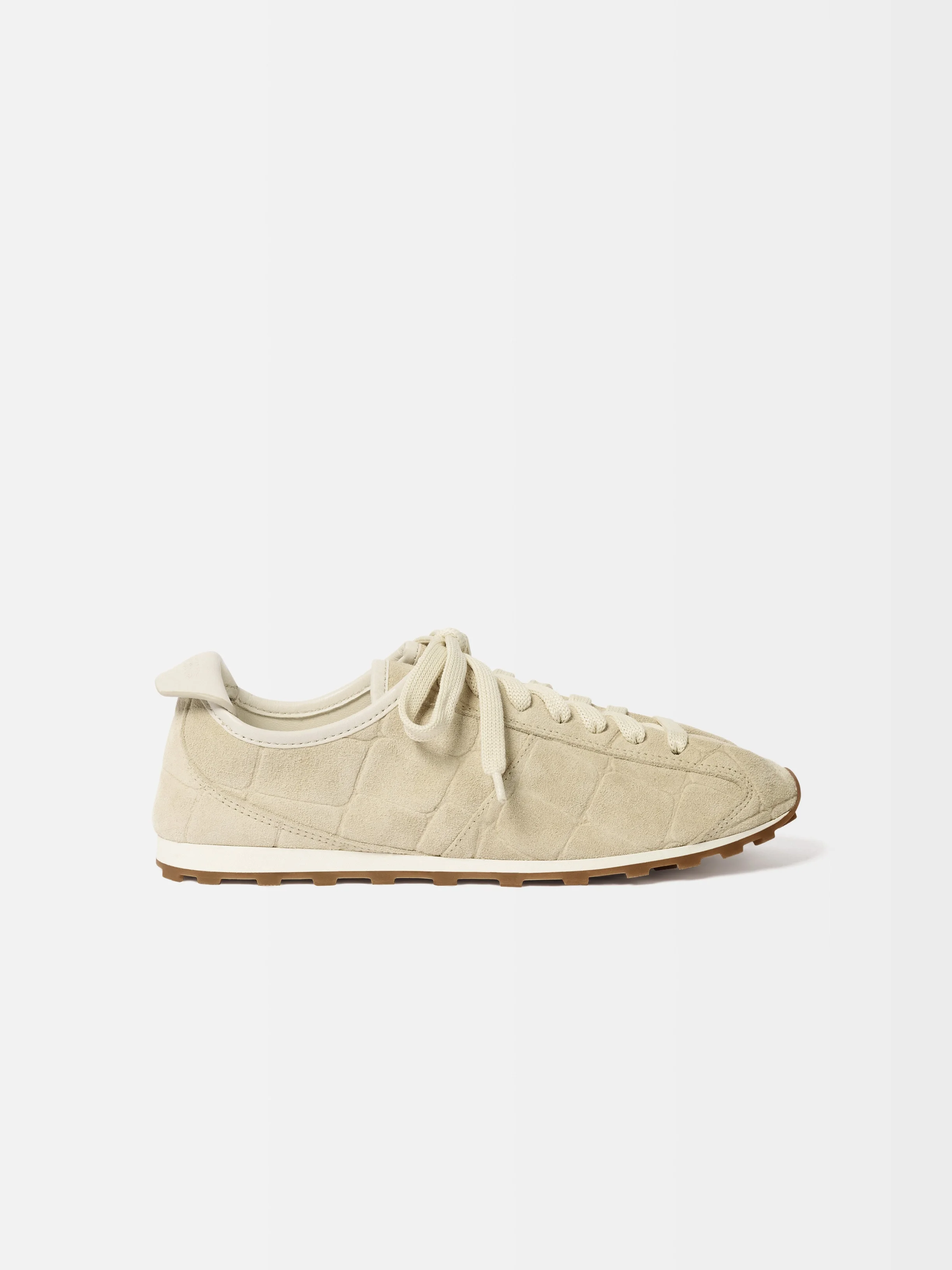 Soft sneakers - Sneakers in soft crocodile-embossed suede - Almond-shaped toe - Flat laces - Embossed logo on the tongue - Embossed logo on the heel tab - Removable leather-covered insole - Rubber outsole in a round and square shape Please note that these shoes have a slim fit. We recommend choosing one size above your usual shoe size for optimal comfort. 100% Calf Leather / Outsole: 100% Thermoplastic Polyurethane Made in Portugal Ref. FOW00175AC07A10120