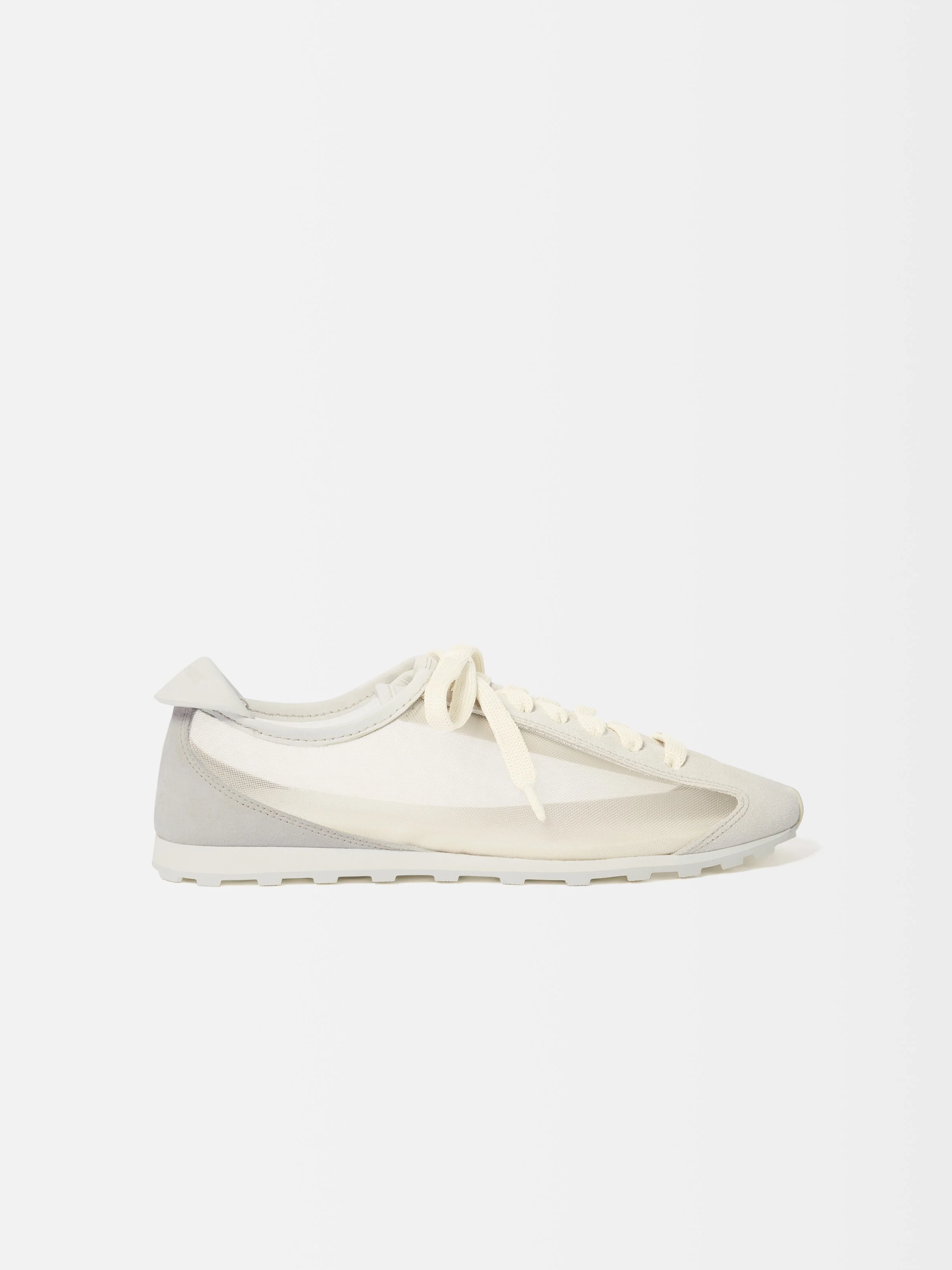 Soft sneakers - Sneakers in transparent mesh and suede leather - Almond-shaped toe - Flat laces - Embossed logo on the tongue - Embossed logo on the heel tab - Removable leather-covered insole - Rubber outsole in a round and square shape Please note that these shoes have a slim fit. We recommend choosing one size above your usual shoe size for optimal comfort. 100% Polyamide / Outsole: 100% Thermoplastic Polyurethane Made in Portugal Ref. FOW00175AC43O01110