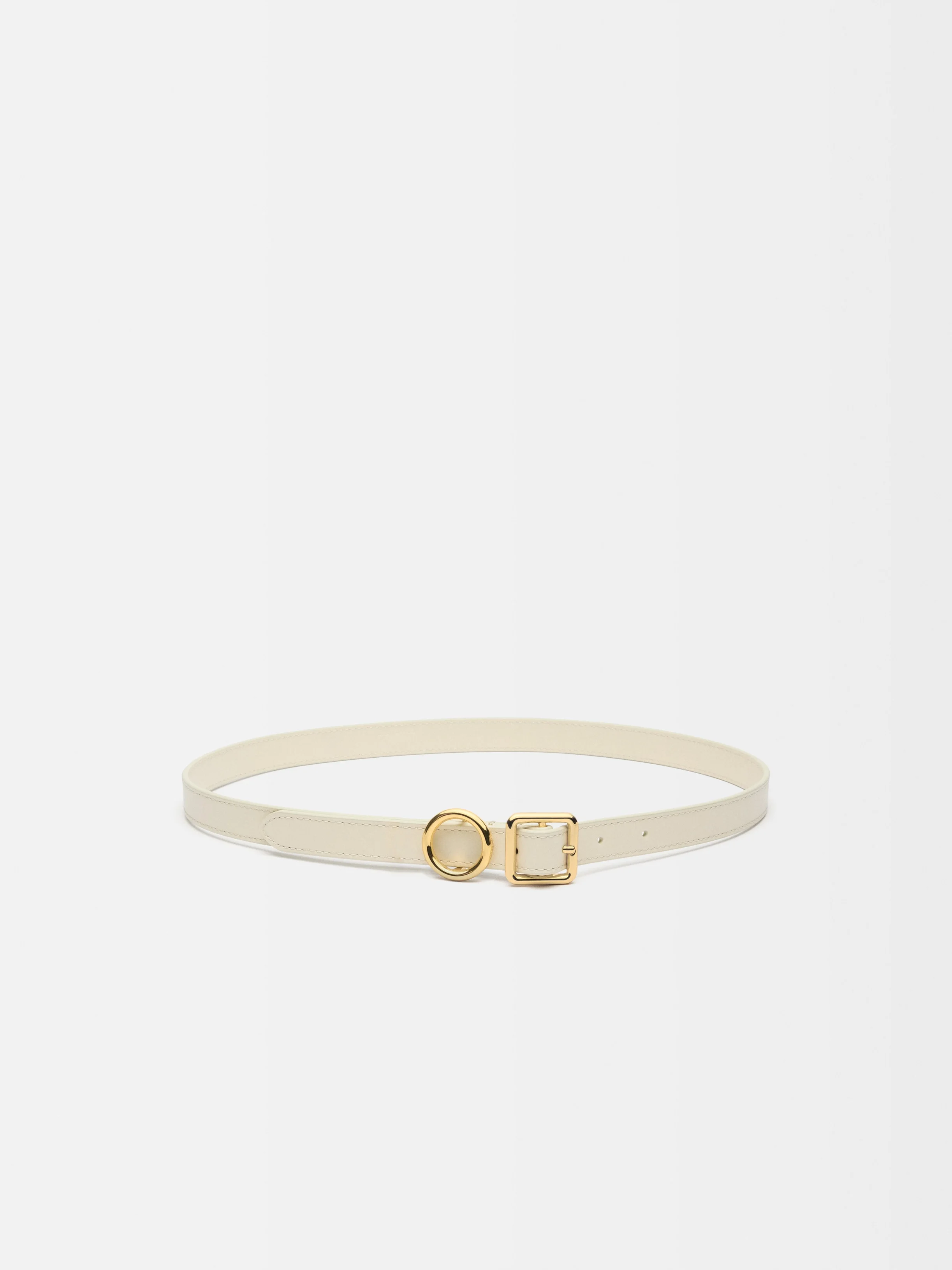 Circle and square thin buckle belt - Thing belt in smooth leather - Circle and square gold metal rings - Perforations and topstitching - Engraved logo - Five adjustable lengths - Width: 2cm 100% Cow Leather Made in Italy Ref. BEW00345AC01C02113