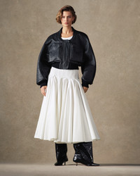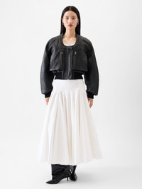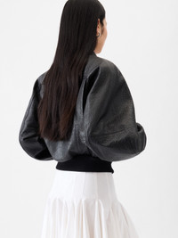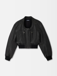 Open-neck-bomber - Oversized fit - Grained lambskin leather - Round open neckline with snap button - Rounded sleeves - Slanted zipped pockets - Front and back yoke - Hidden zipped closure with a snap panel - Zipped gusseted pockets - Ribbed cuffs and hem - Embossed logo on the back - Two back pleats - Fully lined The model is 177cm and wears a size 38 100% Lamb Leather / Lining: 52% Viscose - 48% Cotton Made in Tunisia Ref. OUW00114AC03L03990