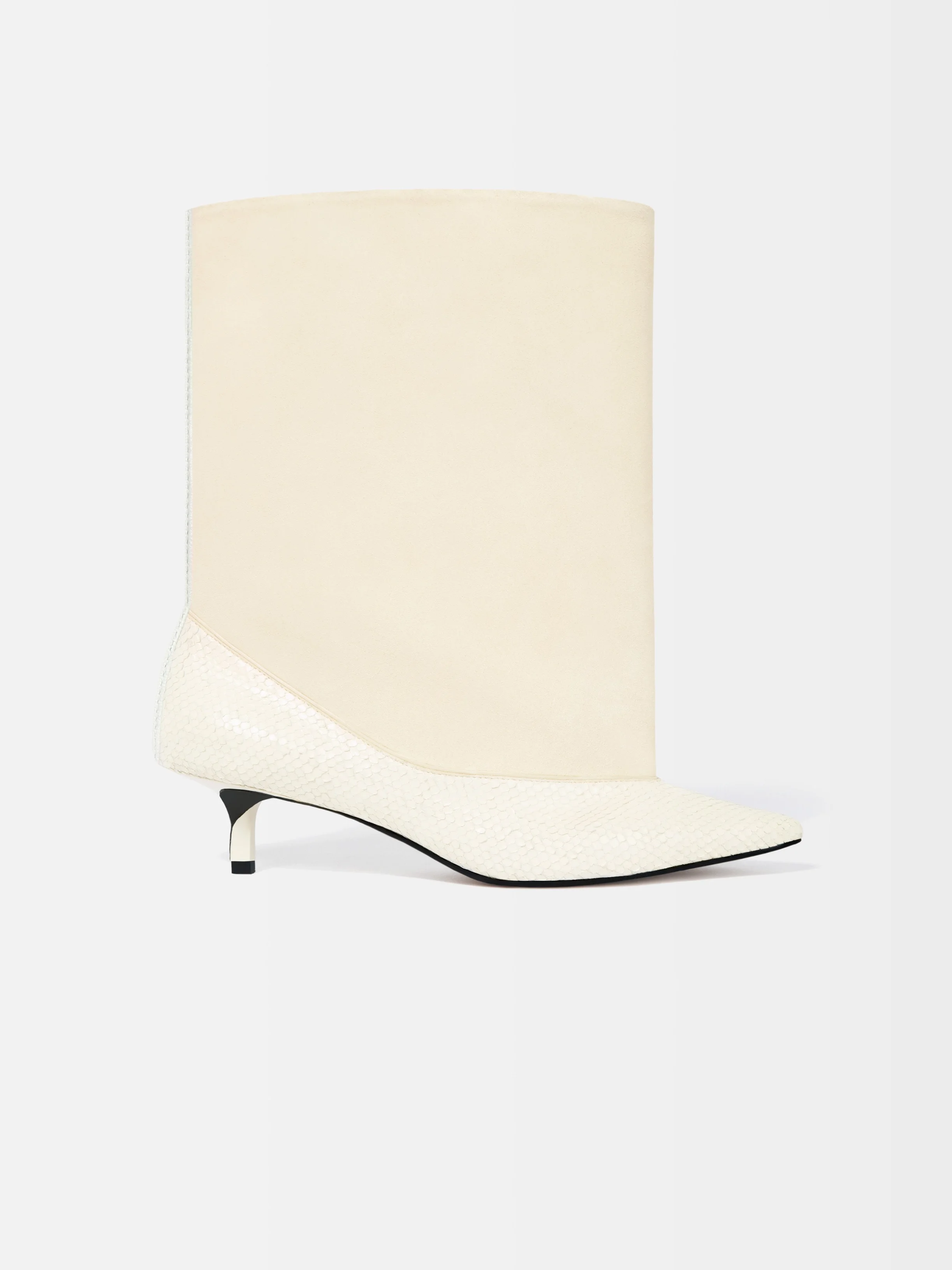 Wide boots - Structured tubular boots in structured suede - Trompe-l'oeil python-embossed leather pump shape - Pointed toe - Mid-calf cut - Lambskin leather insole and lining - 4.5cm asymmetric twisted heels with lacquered finish - Contrast outsole To protect the leather soles of all shoes, a transparent protective film has been applied to each sole. To remove it, please follow the direction of the arrow in order not to damage the leather sole. 100% Calf Leather / Outsole: 100% Cow Leather Made in France Ref. FOW00177AC24M05115