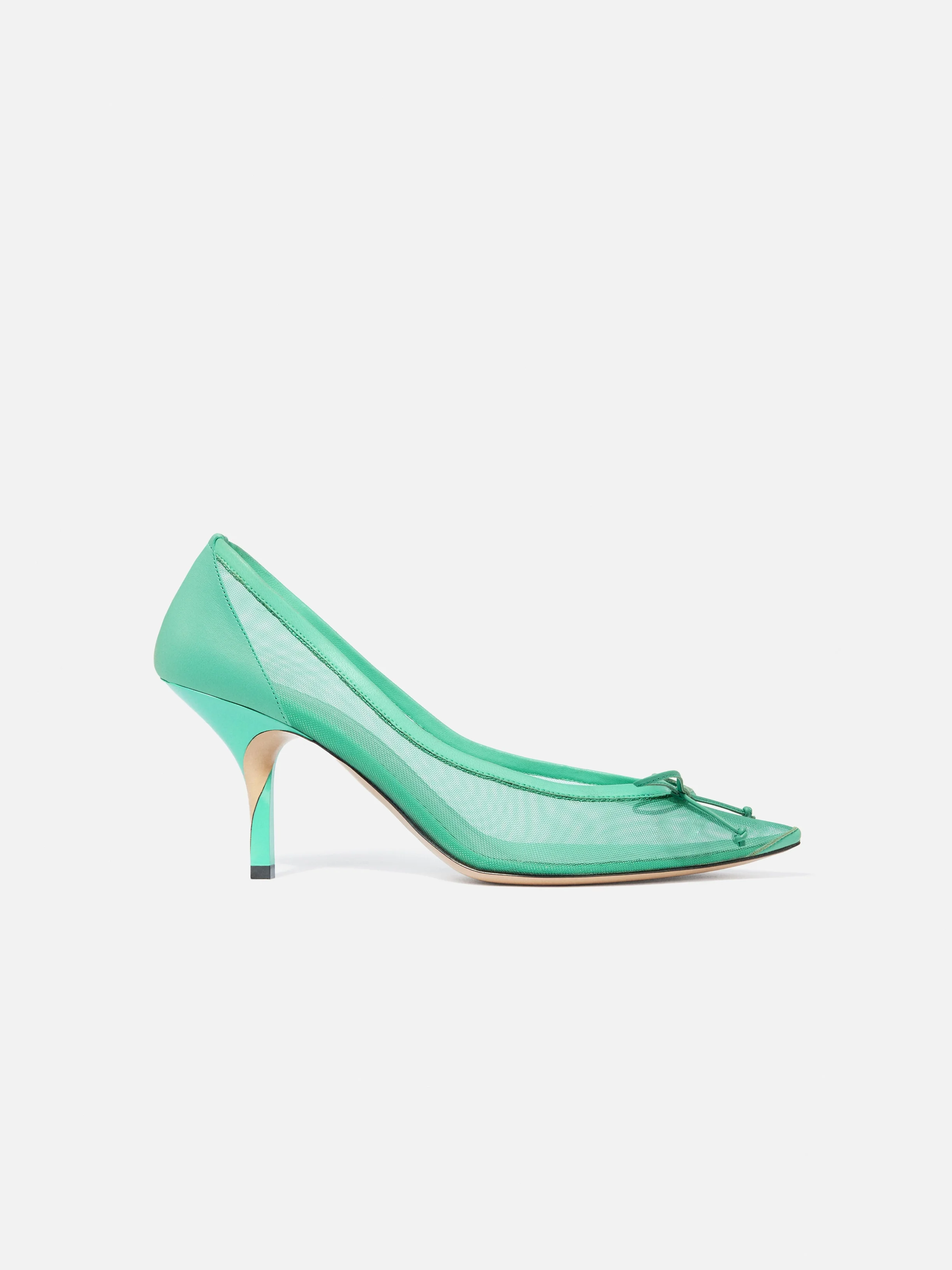 Twisted pump heels - Pump heels in transparent mesh - Pointed toe - Small fixed bow - Stitched edges - Lambskin leather insole and lining - 8cm asymmetric twisted heels with lacquered finish - Contrast outsole To protect the leather soles of all shoes, a transparent protective film has been applied to each sole. To remove it, please follow the direction of the arrow in order not to damage the leather sole. 100% Polyamide / Outsole: 100% Cow Leather Made in Italy Ref. FOW00178AW00661545