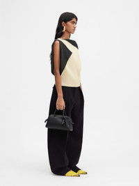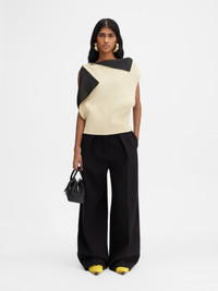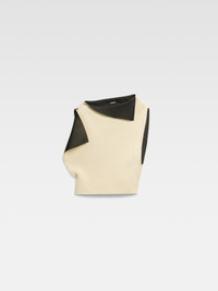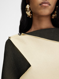 LA CROISIERE Square-structured knit top - Asymmetric draped shape - 3-D effect double sided viscose knit - Boat neck - Draped corners - Rond-Carre shoulder brooch The model is 171cm and wears a size 34 60% Viscose - 40% Polyamide Made in Italy Ref. 251KN607-2437-210