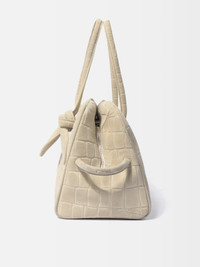 Soft bowling bag - Bowling bag in crocodile-embossed suede - Double-sided zipper - Tubular handles in matching leather - Knotted detail on handle - Removable cross-body strap - Embossed logo - Interior pocket - 15,3 in x 8,3 in x 6,7 in Each leather is unique and has been carefully selected by our team. To maintain the original condition of this item, we recommend to avoid direct and over-exposure to light and contact with cosmetics, water or heat. We advise to store this item into the dust bag in a dry place. 100% Calf Leather / Lining: 100% Cotton Made in Italy Ref. BAU00417AC07A09120