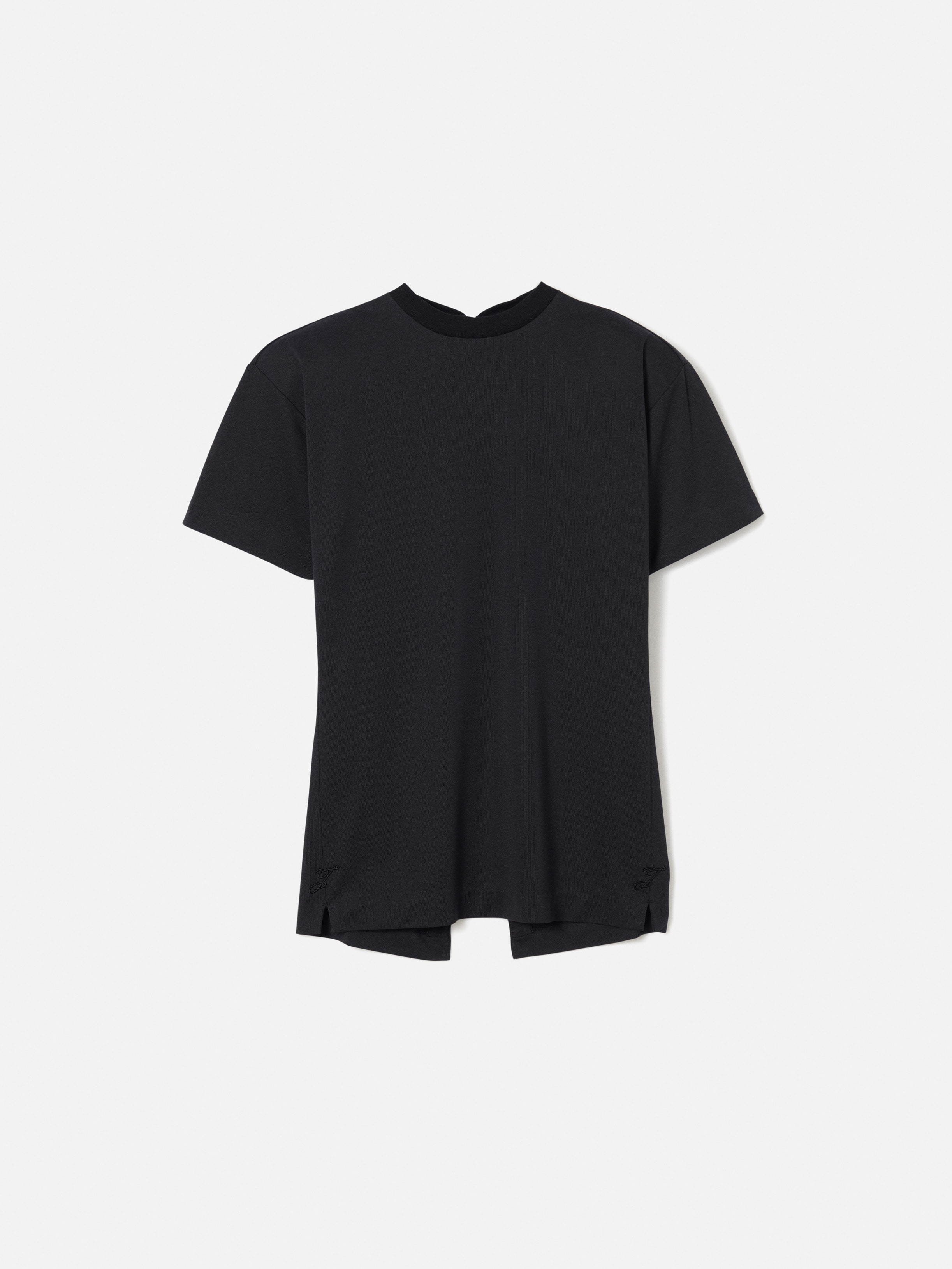 Open back t-shirt - Straight fit - Paper jersey - Crew neck - Short sleeves - Side slits with an embroidered “J” on each side - Three-button and loop closure on the back - Partially open back with draped panels on each side The model is 178cm and wears a size XS 57% Paper - 43% Polyester Made in Portugal Ref. TSW00589AJ00254990