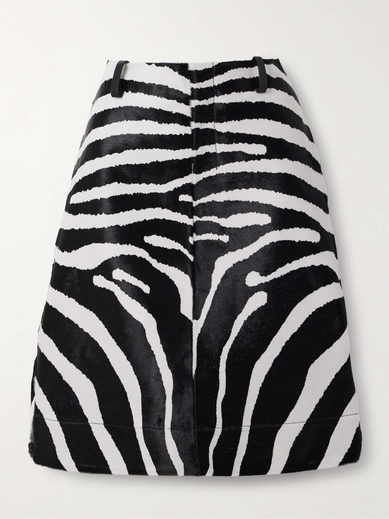 EDITORS'NOTES Jacquemus' 'La Jupe Tozzi' skirt will make a bold statement wherever you are. Falling to below the knee, it's made from tactile pony hair that's patterned with a striking zebra print and trimmed with leather belt loops. Wear yours with a tank and sculptural mules. SIZE & FIT Model measurements: - Fits true to size, take your normal size - Midi-length, designed to be worn at the hip - Supple, slightly stretchy leather - Model is 180cm/ 5'11" and is wearing a FR 36 - Bust: 77cm/ 30.5” - Waist: 60cm/ 23.5” - Hip: 92cm/ 36” DETAILS & CARE - Black and white zebra-print pony hair, black leather (Lamb) - Concealed hook, button and zip fastening at front - 100% pony hair (Cow); trim: 100% leather (Lamb); lining: 97% cotton, 3% elastane - Specialist clean