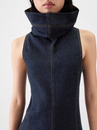 High stand-collar denim dress - Long fitted shape - Stretch indigo denim-cashmere blend - Contrast stitching - Wide stand collar - Embroidered “J” on the collar - Sleeveless - Invisible side zipper - Godets - Ankle-length flared hem The model is 177cm and wears a size 34 93% Cotton - 6% Cashmere - 1% Elastane Made in Romania Ref. DRW00720AD00041390