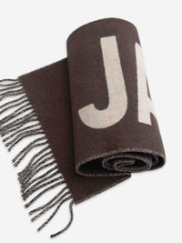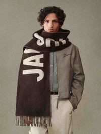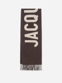 SKU: 796-000122 01 BRAND ID: 22HACU00435AOT4001 Wool Jacquard Scarf Scarf By Jacquemus • 180 x 35 cm • 12 cm of fringes at both ends • Jacquard logo • Solid color thread • Made of wool fabric Composition: 100% wool Italy