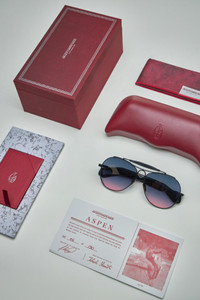 Iconic Cos-inspired shooter-style glasses from the Titanium Series featuring an acetate-bar brow accent as well as sculptural acetate temples. Materials: 100% titanium Color: dark sunset black Made in Japan SKU: 141890 Brand style: JMMASP-88