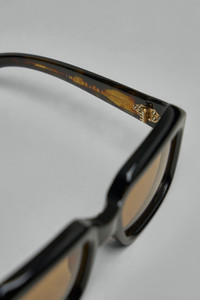 Sunglasses with chunky black acetate frames and amber-tinted lenses. The oversized square silhouette features a curved bridge and gold dot accents on the temples. Materials: 100% Acetate, 100% Titanium Color: monday monday / sepia cr39 / dark gold SKU: 153742 Brand style: JMMMF-K31